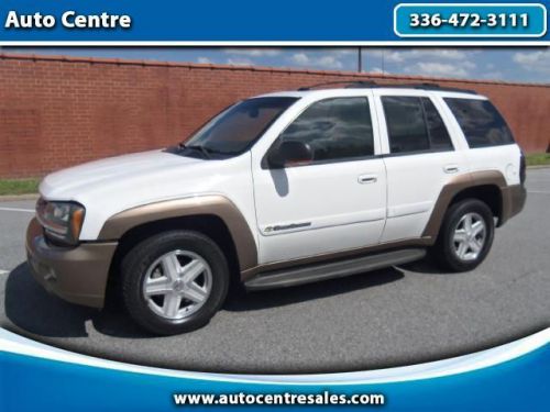 This 2002 Chevrolet Trailblazer LTZ is one nice ride!! Comes very well equipped, clean and comfortable interior, and runs/drives great!!! Hurry in for your test drive today!! All of our vehicles go through a full mechanical check out, pass North Carolina Inspection, and a CARFAX report will be provided upon request. Contact us at 866-479-8450. ***Prices listed do not include State tax, title/tag/registration, or our $149.00 Documentation Fee*** All vehicles are sold AS IS, NO WARRANTY. You are welcome to take the vehicle, at your expense, to a local mechanic PRIOR TO PURCHASE. Down payments DO NOT include tax, tag, and titling fees. Please see our web site ( www.autocentresales.com ) for information on our In-House Finance Program.Please note: Our ads are posted by people, and people make mistakes. Although we try to post as accurately as possible, instances of typos or misinformation may occur. We cannot be held accountable when these errors occur. We apologize in advance for any inconvenience. Some of our advertisers offer limited photos. To view all photos available, go to http://www.autocentresales.com. Visit Auto Centre online at www.autocentresales.com to see more pictures of this vehicle or call us at 866-479-8450 today to schedule your test drive. Auto Centre Inc. has been in business by the same owners for over 18 years. We pride ourselves in selling first class vehicles at the lowest possible price. We have an award winning full service shop on the lot! Call us first before you pay too much somewhere else. Located conviently off of I-85 in Thomasville. Call Auto Centre Today! 866-479-8450