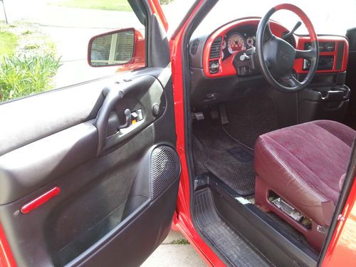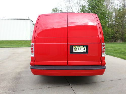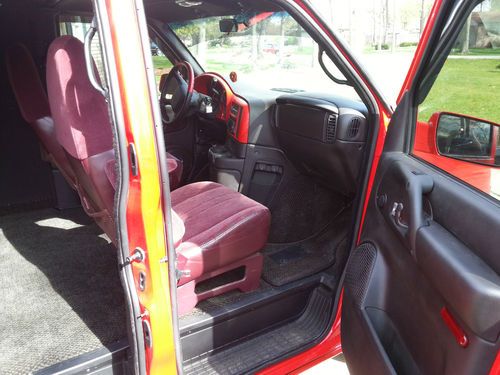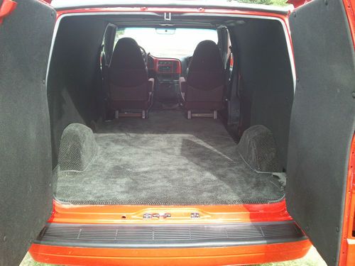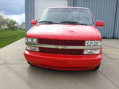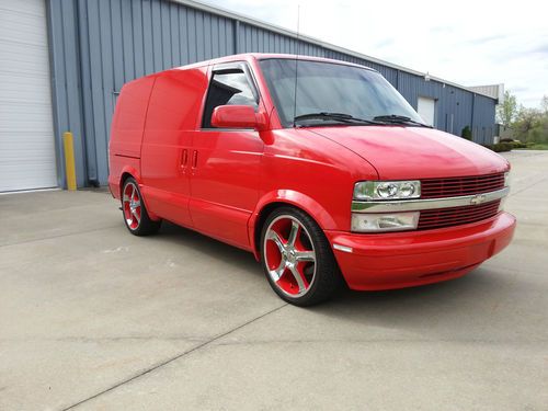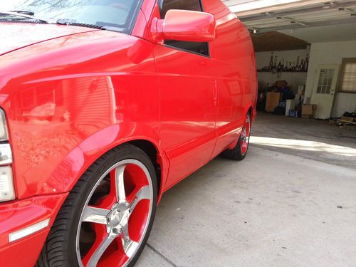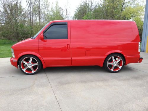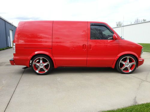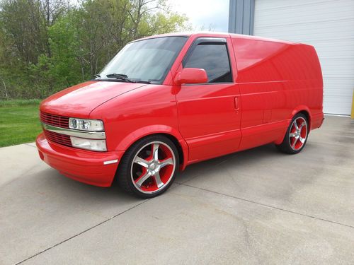 hi i have a 1999 chevy astro cargo that i am selling,i baught this van from a local water company,it was white with the workmans front end,with blue int,with its only option(air).we have dumped some money into it over 3 years to get it to this point.new front end,as in dog house not because it was wrecked just because i did not like the workers front end.so it has the comp.lights in front.all new front end parts like upper,lower ball joints,and inner and outer tie ends,new rotors,ceramic pads,along with new 2'' lowering spindles,and new wheel bearing,and to top that off a new alignment.new windsheild,was taking out when we painted it .the color is 1996 corvette torch red.the rear end has a new flip kit to match the front stance.looks great and rides great just like factory.,the inside now has all black dash with 2 tone leather wraped stearing wheel from a blazer,black with red.and color painted dash.head liner is a 4 piece done in all black tweed and the side walls are also done in tweed,a sub floor was done so that the floor was flat and not like a truck bed with all the grooves and the carpet is top of the line shaw berber carpet,with a thin foam backing.the van has power windows ,power locks,tilt wheel with air.under all that this van holds 200 sq feet of sound deading for sound.this van was going to be my sound van,but now i have lost interest in it and now im looking for something else.this astro runs and drives like a new one.the owner ran ams oil in the engine for most of its whole life and the tranny only has 140.000 on it because of a bad spider gear.cheaper to buy a used tranny then to rebuild it.also the doors on this van were new ,i wanted a no window van so i baught 2 new back doors from gm and also a new slider door because u can not find them used.,the slider door by it self was a 1000 bucks and the 2 rear doors were 800 each.over all the body had no rust to fix when it was time to paint.so it is a rust free van.the custom astro sits on 20 inch rims chrome and painted to match red with new 255 35 20 tires.and if you have noticed this van has all the factory ground effects off of a passenger astro van.the cargo vans did not come with that option.this van would be a great cruzer or show van or hell a good looking work van.i live in elkhart,in and i will also looking for trades on a corvette,84 and newer.if interested please shoot me a text at 574-322-1751.thanks for viewing my astro .all sales are final and as is where is.