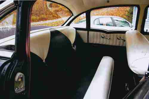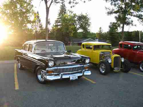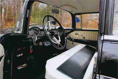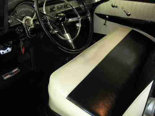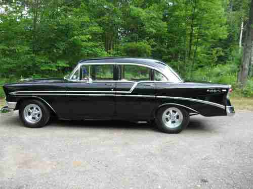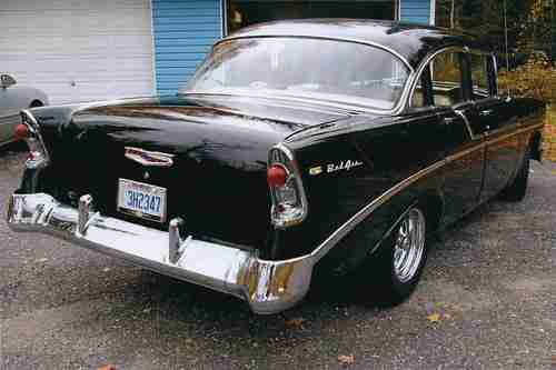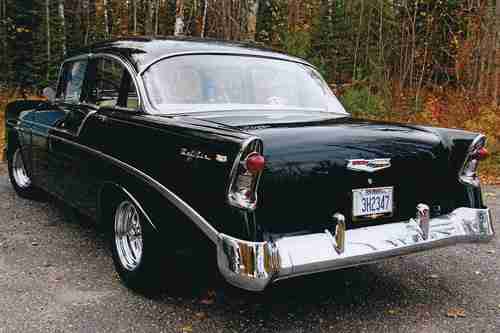 1956 CHEVROLET BELAIR V8 FOUR DOOR SEDAN,FRAME UP RESTORATION COMES WITH FULL APPRAISAL. THE CAR IS BLACK COLORED WITH BLACK/WHITE INTERIOR.VIN C56A109726,ODOMETER REGISTERING 35,002 MILES.THIS CAR IS FRESHLY RESTORED TO ORIGINAL WITH COSMETIC & PERFORMANCE IMPROVEMENTS AND IS IN EXCELLENT CONDITION RATING A ( 2 + ) ON THE P.A.V.E NUMERIC CONDITION GUIDE WHICH IS INCLUDED WITH FULL APPRAISAL REPORT. CAR IS APPRAISED AT $ 58,000.00 CAD. THE ALL STEEL BODY IS RUST FREE WITH NO PREVIOUS RUST REPAIR OR BODY FILLER MATERIAL.THE UNDERBODY IS VERY CLEAN AND IS RESEALED WITH BLACK UNDERCOAT MATERIAL.THE BLACK PAINT FINISH IS VERY PRESTINE REFLECTING THE EXCELLENT BODY CONDITION THROUGHOUT.ALL CHROME IS VERY GOOD AND IS COMPLETE WITH ORIGINAL CHROME MOULDINGS,NEW REPRODUCTION EMBLEMS AND IDENTICATION BADGES. ALL GLASS IS DAMAGE FREE AND THE TWO-TONE BLACK AND WHITE VINYL INTERIOR IS IN "SHOWROOM" CONDITION WITH ATTENTION TO DETAIL THROUGHOUT. THE CAR IS POWERED BY A CHEVROLET 283 CID V8 ENGINE CONNECTED TO A 350 TURBO THREE - SPEED AUTOMATIC TRANSMISSION WITH FINAL POWER TO A ( 3.55 ) POSI REAR AXLE. THE ENGINE COMPARTMENT AND THE ENGINE ARE EQUIPPED WITH MANY EXCELLENT COSMETIC IMPROVEMENTS WHICH CAN BE SEEN IN THE PICTURES LISTED . THE SEPARATE FRAME AND CHASSIS IS EXCELLENT AND IS EQUIPPED WITH EXCELLENT OPTIONS SUCH AS POWER - STEERING,POWER DRUM BRAKES AND STAINLES STEEL DUAL EXHAUST.4 "CRAGER " CHROME ALLOY WHEELS WHICH ARE FITTED WITH A MATCHED SET OF (4) NEW B.F GOODRICH RADIAL T/A TIRES. THE QUALITY OF THE BODY,PAINT,INTERIOR,ENGINE AND CHASSSIS IS EXCELLENT AND OUTSTANDING . THE ENGINE COMPARTMENT IS VERY WELL ORGANIZED AND CLEAN.THE FIREWALL ALONG WITH THE INNER FENDERS AND FRONT RADIATOR SUPPORT ARE FINISHED IN A SEMI-GLOSS BLACK PAINT.THE CAR IS POWERED BY A SMALL BLOCK LATER MODEL "283" CID CHEVROLET V8 ENGINE WHICH HAS BEEN RECONDITIONED AND IS FITTED WITH UPGRADE COMPONENT PARTS.THE ENGINE HAS BEEN REBUILT/ CLEANED AND DETAILED WITH "CHEVROLET" ORANGE PAINT AND IS FITTED WITH A PAIR OF FINNED ALUMINUM EDELBROCK TALL VALVE COVERS.THE ENGINE IS EQUIPPED WITH A COMPETITION CAMSHAFT WITH (500-LIFT) (274) DURATION.IN ADDITION,THE EDELBROCK INTAKE MANIFOLD IS FITTED WITH AN EDELBROCK (650 CFM) FOUR- BARREL CARBURETOR WHICH IS TOPPED WITH A "VELOCITY STACK" CHROME AIR BREATHER.THE ELECTRICAL SYSTEM IS VERY GOOD AND IS EQUIPPED WITH AN AFTERMARKET "POWER" DISCONNECT SWITCH,A NEW "HIP"12 VOLT BATTERY,AN INTERNALLY REGULATED DELCO ALTERNATOR AND AN ORIGINAL BREAKER POINT IGNITION SYSTEM WHICH IS FITTED WITH NEW PREMIUM PLUGS & WIRES.THE COOLING SYSTEM IS IN EXCELLENT CONDITION CONSISTS OF CORRECT MOLDED HOSES, A STANDARD FAN AND A NEW 3-CORE HEAVY-DUTY DOWN-FLOW RADIATOR.THE RADIATOR IS CONNECTED TO A NEW CHROME EXSPANSION TANK.IN ADDITION,THE ENGINE IS EQUIPPED WITH NEW CERAMIC HEADERS WHICH FLOW TO A NEW DYNA-MAX STAINLESS STEEL DUAL EXHAUST SYSTEM.OTHER UNDER HOOD EQUIPMENT INCLUDES NEW CHROME CORVETTE POWER BRAKE BOOSTER,NEW CHROME MASTER-CYLINDER,NEW TRANSMISSION COOLER NEW FOUR WHEEL DRUM BRAKES.NEW POWER STEERING,POWER BRAKES,HEAT/DEFROST AND WINDSHIELD WIPER/WASHERS.ALL WIRING IS EXCELLENT NO OIL,COOLANT OR FUEL LEAKS FROM ANY OF THE ENGINE COMPONENTS.THE ENGINE IS PROTECTED BY ROYAL PURPLE 20/50 SYNTHETIC OIL AND FILTERS. THE TWO-TONE WHITE AND BLACK VINYL DELUXE INTERIOR IS IN EXCELLENT CONDITION WITH NO WEAR OR DAMAGE.THE HEADLINER IS VERY GOOD AND THE CAR IS EQUIPPED WITH THE STANDARD REARVIEW MIRROR,DUAL SUN VISORS AND REMOTE-CONTROLLED DOME LAMP.THE TWO TONE DOOR PANELS ARE COVERED WITH QUILTED WHITE AND BLACK VINYL AND ARE COMPLETE WITH ARMRESTS&ORIGINAL TRIM AND HANDLES.THE BLACK FLOOR CARPETS IS EXCELLENT AND IS COMPLETE WITH VERY GOOD TRIM PLATES AND IS PROTECTED BY VINTAGE BLACK VINYL GM FLOOR MATS.THE FRONT AND REAR SEATS ARE A TWO TONE WHITE/BLACK VINYL AND ARE IN EXCELLENT CONDITION.THE STEEL DASH IS EXCELLENT AND THE CAR IS COMPLETE WITH ORIGINAL INSTRUMENTATION WHICH INCLUDES A CLASSIC LOOK AM/FM STEREO WITH HOOK UP FOR I-POD ,PREMIUM PIONEER REAR SPEAKERS.CAR IS EQUIPPED WITH A SET OF UNDER THE DASH "SUN-PRO" MONITORING GUAGES. THE DASH IS NICELY TRIMMED WITH THE ORIGINAL ALUMINUM,AND ORIGINAL BOWTIE ORNAMENTATION.THE STEERING COLUMN IS VERY GOOD CONDITION AND THE ORIGINAL STEERING WHEEL IS EXCELLENT AND DAMAGE FREE COMPLETE WITH A VERY GOOD HORN RING.ALSO CAR IS EQUIPPED WITH A "LOKAR" FLOOR-SHIFT GEAR SELECTOR FOR THE AUTOMATIC TRANSMISSION.WITH THAT STANDARD LOOK AND FEEL.THE BODY, DOORS,QUARTER PANELS TRUNK,HOOD AND INNER&OUTER FENDERS,FLOORS AND ROOF ALL STEEL EXCELLENT CONDITION. I HAVE FULL APPRAISAL REPORT DETAILED WITH 14 PAGES AND HUNDREDS OF PICTURES OF EVERY PART OF CAR. FULL APPRAISAL DOCUMENT AVAILABLE, AND CAN BE E-MAIL IF REQUESTED @ happydays1956@hotmail.com . CAN HELP WITH SHIPPING TO ANYWHERE IN UNITED STATES AND CANADA.WILL ALSO HELP WITH SHIPPING WORLDWIDE BUYER IS RESPONSIBLE FOR ALL SHIPPING COST. CHEERS AND THANKS FOR LOOKING.
