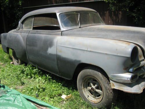 1954 Chevy Bel Air, 2 door coupe (no post) Camaro subframe and rear axle. No engine. Sheet metal is in great shape. No holes, just surface rust. Frame is solid. This is a project car that needs completion. Extra parts (i.e. 2 front fenders and numerous trim pieces) included. Comes with new, grey headliner fabric, upholstery for floor, and fabric for door panels. Custom seat covers also included, but have some storage damage (mold/mildew spots). Title clear and ready to be transferred. |