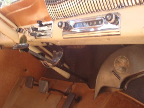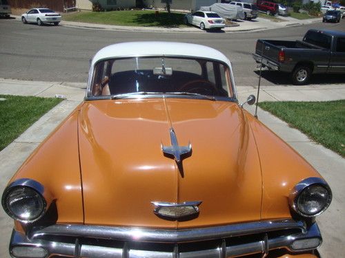 Okay, I know the description isnt worded very well.. Guess next time not to list an item after a bbq with friends and drinks...However this 54 chevy bel air is in great shape.. I cant believe I decided to sell it.. The engine runs good and the trans shifts well. The body has no rott and is in good shape. The glass is all in great shape andso is all the stainless except the passenger front fender..The fender trim has dings along with the passenger door trim. Could be straightened or replaced. The bumpers are straight and solid 1 piece california bumpers original to the car..Everything you see is how I picked it up, except the changes I made to get it running better.. I have been driving it every day.. The spare tire well has rust but the rest of the car is solid..I did hand buff the car the first week I had it to bring back some shine..Looks good.. The original owners manuel was in the glove box along with some other papers. Has original glove box and glove box light works. Grill is straight except the passenger side end piece where the old lady got into the garage door trim. Everything works except the radio..Blinkers, wipers, sig lighter, ect all work. The car was taken care of well. The trunk has the original card boards in it still but I removed the rubber mat. The car still has the screen in front of the radiator.. Any questions please ask and I will answer or send any extra pics as needed.. Thanks for looking and sorry about the original description not making since.. Hope this helps..All docs and paper work will come with the sale.The hubcaps are the original ones to the car..