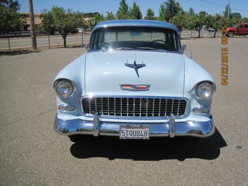 After-marked add-ons include: Air conditioning Front Disc Brakes Stereo Radio/CD player Electric windshield wiper motor New Exhaust System Seat Belts, front and rear The restoration work includes: New Paint Re-chrome bumpers, guards and horn ring Re-arch leaf springs New Shocks Overhaul Carburetor New Radiator Core New door handles and outside R/V mirror New tail light bezels Replaced Chevy Script, Chevy Hood Emblem, Chrome Gas Door Guard, Paint Dividers and Hood Bird to eliminate any blemishes Extra set of "Baby Moons", original tires and wheels also included. Interior restoration includes: New Upholstery New Carpet and Sill Plates New Headliner New Visors New Weather Strips Bel Air Dash Trim Have the original sales contract and service receipts from 1955 showing the low accumulation of miles. When the original owner passed away in 1998, the records indicate the car had only 47K miles on it. Selling this vehicle because we're retired and "downsizing." Have receipts for ALL work done on this car organized in a binder. Encourage an independent full inspection. You won't be disappointed!