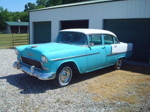 1955 CHEVROLET BEL-AIR 4 DOOR SEDAN, 350CI ENGINE, 3 SPEED MANUAL TRANSMISSION, RUNS AND DRIVES GREAT! BEAUTIFUL/ORIGINAL UN-CUT DASH, RADIO DELETE, ORIGINAL STEERING-WHEEL, ORIGINAL HUB-CAPS, THE GENTLEMAN I PURCHASED THIS CAR FROM RECENTLY SPENT THREE THOUSAND DOLLARS ON THE UNDERCARRIAGE REPLACING THE REAR LEAF-SPRINGS, NEW FRONT AND REAR SHOCKS, ALL NEW BRAKES, BRAKELINES, AND WHEEL CYLINDERS, ALL NEW FRONT-END BUSHINGS, BALL-JOINTS, TIE-ROD ENDS, FRONT-END ALIGNMENT, ETC., NEW DUAL EXHAUST SYSTEM, OLDER RESTORATION, OLD PAINT, COOL OLD-SCHOOL TUCK-N-ROLL INTERIOR, SOLID SOUTHERN BODY WITH MINOR RUST EASILY REPAIRABLE, COOL FATHER/SON/DAUGHTER PLAYTOY TO ENJOY AS IS OR BUILD TO YOUR LIKING, MANY POSSIBILITIES WITH THIS ONE, BIDDERS WITH ZERO/NEGATIVE FEEDBACK MUST CONTACT ME BEFORE BIDDING OR I WILL CANCEL YOUR BID/BIDS, THANKS FOR LOOKING!!