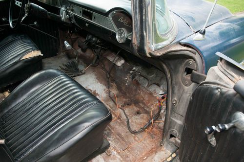 1955 Chevy Bel-Air HARDTOP, 327 3-speed. This car needs restoration but is a very solid and complete platform. All new tune up parts, new battery, COMPLETE brand new wiring harness (mostly not installed), new rocker panels, extra "Saginaw" 4-speed trans and a bunch of other misc parts go with the car. Engine turns over with the key and I expect it to "fire" by time of sale. Interior looks to be out of a mid-late 60's Impala in decent shape with some seam splitting as seen in the pics. Will need door glass on both sides and does have rock chip in windshield. Its getting harder and harder to find complete 55 hardtop!