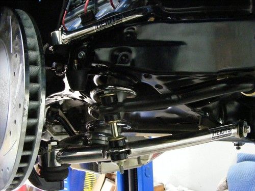 Heidts upper & lower tubular control arms. Chromed and polished for show. Heidts 1 1/8 sway bar. QA1 coil over with chromed springs. Close ratio power steering box with all new steering components.