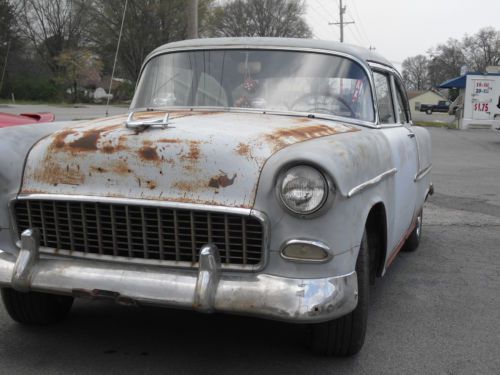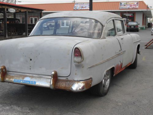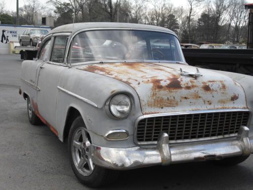 WE HAVE FOR SELL A 1955 2 DOOR BEL AIR, IT IS A RUNNING AND DRIVING CAR,WITH A 350 AUTO TRANS AND POWER BRAKES,THE ENGINE RUNS VERY GOOD NO SMOKE OR NOISES GOOD OIL PRESS AND RUNS COOL, TRANS SHIFTS GREAT,BRAKES STOP GOOD BUT PULL TO RIGHT WHEN HIT HARD DOES NOT PULL WHILE DRIVING AND RIDES GOOD, THE BODY NEEDS USUALLY RUST REPAIR,BOTTOM OF QUARTERS ROCKERS AND INNER ROCKER,TAIL PAN,FLOOR PANS WERE FIBERGLASS OVER YEARS AGO,CAR CAN BE USED AS IS BUT BRAKE AND TURN LIGHT NEED WORK,I TRIED TO PICTURE EVERTHING IF YOU HAVE QUESTIONS PLEASE CALL 770-324-4098, THE CAR IS LOCATED IN GEORGIA AND IS SOLD W/ A STATE OF GEORGIA MOTOR VEHICLE RECEIPT AND A BILL OF STATE FROM REGISTRY OWNER,SO YOU SHOULD NOT HAVE ANY ISSUES TO TAG IN YOUR STATE,GEORGIA DID NOT ISSUE TITLE UNTIL 1963 AND WILL NOT ISSUE THEM NOW ONLY REGISTRY RECEIPTS, ALL NEW SIDE GLASS,NEW GAS TANK JUST PUT IN NOT PICTURES,