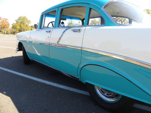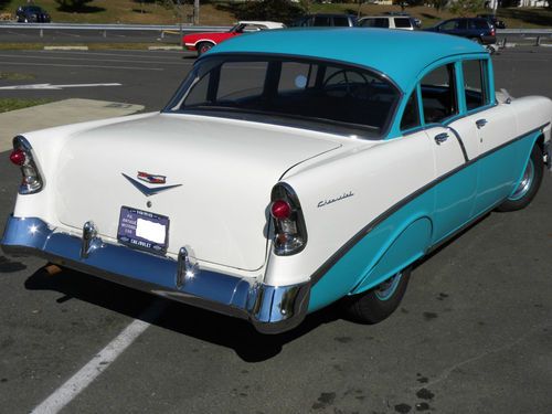 Up for sale is a 1956 Chevrolet Belair 210 4 Door Sedan. This great ride was restored 4 years ago and now has a 350 with a two barrel carb, but still has the original 2 speed power glide transmission that was re-built. It still has all the original items. When this Chevy was purchased in 1956 it came with no options, it was considered back then the working man's family car. The paint is like new and has no issues as you will notice in the photos. The interior is in great shape and so is all the glass. The starter is new as is the complete exhaust system and the gas tank. All the Chrome is like new. This car looks like it just came off the show room floor. If you want to cruise around in a 50's car this is the one for you. This car runs and drives well. It has nice power, and the brakes are fine. Load up the family and friends and go cruisin' all weekend.