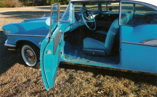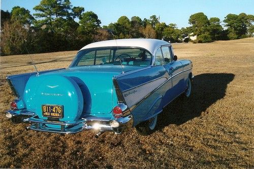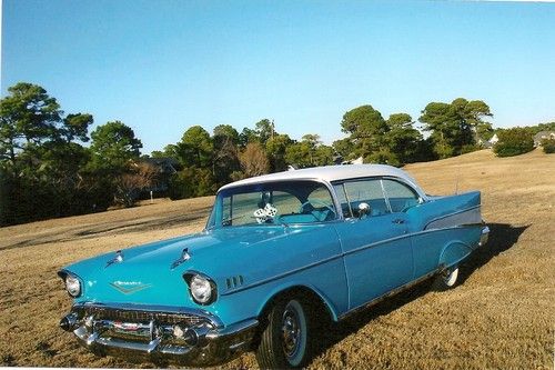 For sale is a nice 1957 Chevy 2dr hardtop. It has about 1200 miles since restoration. It had a frame off restoration about 12 years ago. The car is stored inside and has been well kept. The interior is new and has hardly been sat on. It has a 283 V8 and and a 350 turbo transmission. It has a Vintage air conditioning system,power windows,dual rear antennas. It also has front disc breaks and a new dual exhaust system. It is equipped with spinner hubcaps,new coker vintage tires and continental kit. The turquoise and white paint is only 6 years old and looks great and all the chrome and stainless is excellent. It even am/fm cassette player.