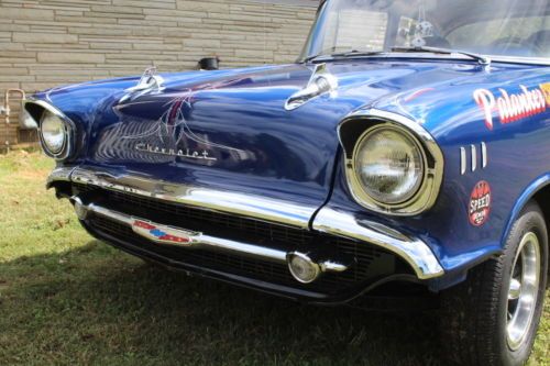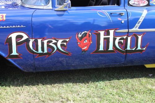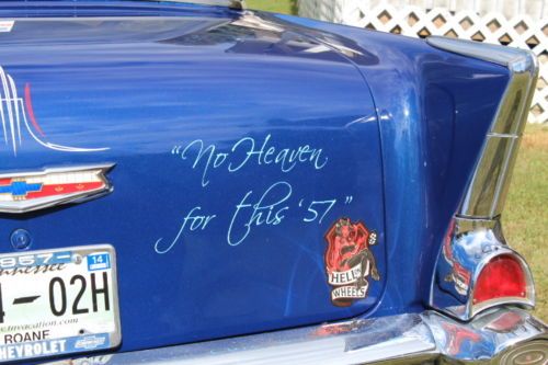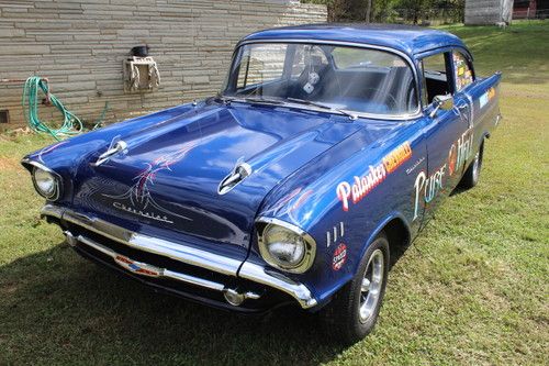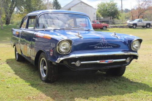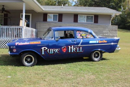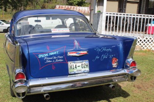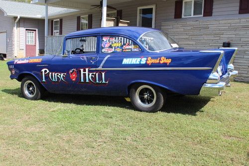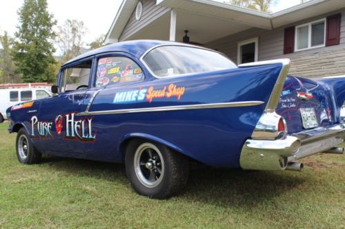 This is a 1957 Chevy 2dr sedan that looks like an old style drag car, but is actually a pretty nice street legal car. Car has a 350 engine with a solid lift cam and Edelbrock aluminium heads, it runs real strong and sounds awesome! 780 Holley carb and electric fuel pump.Car also has a brand new gas tank and sending unit. It has new floor pans and half quarters and door skins. The car also has new interior including sound deadner and carpet with a nice stereo with 8 track player. Everything works on the car besides wipers. i put in a new fuse panel and most new wiring. It has high and low beam lights, turn signals and brake lights. All guages work (oil, temp & volt). also has header cut outs for easy opening. Car has 3:55 gears so it is very driveable and gets a lot of looks. It also has a brand new turbo 350 that shifts like a beast and a brand new 2800 stall converter. The car has new brakes and all new lines front and back. It drives and rides real good, has air shocks and traction bars on back. All stainless and chrome is good, driver quality back bumper is fades some at the bottom half. I put new fender emblems and hood rockets on it and a pretty nice grile bar. I have a new headliner that needs to be installed and will be by the time auction is over.I also have both new door glasses that I will try to have installed before auction closes, if not winning bidder will have to install. paint is nice anbd shiny on the car. It also has new body mount rubbers and bushings installed. Tires and wheels are nice. also has new door rubber. I am sure I left a lot out on this car, if you have any questions just ask. This car is forsale locally also so I reserve the right to stop auction at any time. This is a real fun car that looks good and runs like the name says! Cruise anywhere anytime or throw some slicks on and go racing. Thanks and good luck bidding. Folks this is a nice car with a real fair reserve price,also this is not strictly a race car it is street legal driver that I cruise around in all the time.It is in tip top mechanical shape and looks good 2 if you don't like the paint scheme you can change it and still be into the car good at the price im asking for it.This is the last time im listing it,so if you want a 57 that is in good mechanical shape and looks great 2 and gets thumbs up ever time you drive it this is it.None better for the money. |
