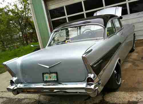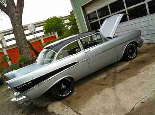 One of the nicest original body super clean & straight 1957 two door - 210 post cars you will find! - This car was a an old hot rod cruiser/racer from back in the day and recently started to be converted to more of a driver friendly ride. All the suspension looks to be in great shape and the front end was rebuilt a few years back and then upgraded to drop spindles, power steering and front power disc brakes. The rear is an original 57 style and sale included a second 350 center section if you so choose to step it up a bit. The frame is solid and not tweaked or bent- it only has normal surface rust for a car of this age. The wheels & tires are in good shape and are Craiger pro stars powder coated black. The body panels and frame are all original and in great shape with no patch work or rust holes. The two tone silver & black paint is older with a few chips & scrapes and is not faded but more like satin finish- would make a good base for a clear paint job to save some money. The chrome and trim is awesome shape with some of the main pieces look to have been re-chromed recently. The interior was done a few years ago and is good shape with upgraded black & gray seats with no rips or damage to fabric. The engine & trans is a SBC and Turbo 350 which came out of previous owners other street rod in good working condition when he decided to go fuel injection. The engine has 4 Barrel carb & aluminum intake, gm serpentine belt setup, small alternator - the trans has a shift kit upgrade. The engine and trans are bolted in place and ready to be hooked to existing wiring and fuel system which both were in good working order before being taken apart. Note front fenders & bumper where bolted in place for transport and will need to be aligned- you will need misc parts to complete build such as a shifter as car was a manual trans and still has clutch pedal in place. All in all the car just needs basic stuff to get it running again and out cruising - so if your looking for an easy project that you can be out on the streets by summer don't hesitate because this hot rod will be gone!