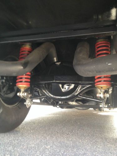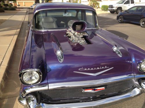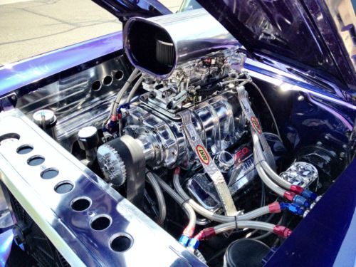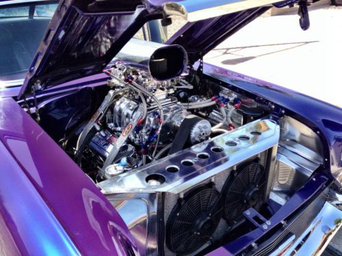 All steel no fiberglass, car was media blasted down to the metal at the beginning of the build. VERY straight body -- 10k in the body work alone. Firewall is smoothed-out and custom built for big block engine. New full rubber set doors, window, lights, handles, mirror, trunk, hood, etc. Custom aluminum inner fender and under hood work. Paint is Radar Blue with clear on top - pearl in sunlight to look purple and dark blue in shade. All new glass and molding ordered from Danchuk. Billet grill with custom emblem gives this car one of a kind look from the front. Original parts all re-chromed by Concours Metal Finishing. Interior was recently completed -- new carpet, panels, Dynamat used on interior, foam on all seats, headliner -- smoke and charcoal colors. Front seats are electric seats from a Cadillac and rear is original 57 back seat. Dash is shaved with Dakota Digital 57 blue kit, clock delete Chevy billet emblem and all new billet trim. Racing Tach installed on steering column. New Billet Specialties steering wheel with leather half wrap. Racing seat belts in front and rear seats. Lokar gas and brake pedals. New door handles and window cranks. Brand new Mickey Thompson 33x21.50x15 Sportsman Pro on rear, 26x7.5x15 Mickey Sportsman Pro on front with Weld Racing Wheels. Engine is brand new with less than 200 miles - 496 cu in built by WFO Racing and Machine, Eagle Crank, Eagle H Beam Rods, SRP Pistons, Inconel exhaust valves, stainless steel intake valves, Jesel belt, ARP main bolts, Melling oil pump, ARP head bolts, Scorpion 1.7 alum roller rockers, Moroso oil pan, Fel-pro MLS gaskets, new cam and lifters. Engine has harmonic balancer for street use. New Weiand 6-71 blower with new dual Edelbrock 800 CFM Performer carbs with blower straps. All new braided stainless steel lines. Automatic transmission with B&M manual racing shift kit with spin-on filter for transmission fluid. Narrowed 9 inch Ford rear end with 4:10 posi gears. Lincoln disc brakes on front and rear with GM vacuum pump mounted on drivers side for brake booster. Moser axles with new shocks and suspension -- rides like a Cadillac. Steering is 605 power steering conversion box. Radiator is Griffin with dual fans. Painless wiring system with MSD ignition system. Two X2Power batteries for extreme cranking power. The sealed AGM design means no acid leaks and improved safety. Made in the USA and backed by a limited 5-year replacement warranty. Alston sub frame, tubbed - rear tubs coated with Por15 Paint. Roll cage with attached fire extinguisher. |
