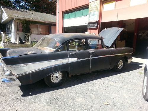 1957 Chevy 210 4 door, this is an orig car, 265 motor with a 3spd, motor is the very rare chartreuse 265 that was only made in the fall of 56 for the 57 models,someone painted the valve covers and intake orange, but when you clean ways the dirt off the block you can see the orig chartreuse, motor starts right up and purrs, ,full windshield sun visor and orig window rain guards are still on the car the floors have been patched by the previous owner, as well as the driver side rocker panel, lower fenders have some rot on them but the car comes with 2 patch panales for the lower fenders brand new holly 600 carb,I do have the orig 2 barrel intake for the motor,new rad,new batt tray and battery, rebuilt generator, new oil pressure sending unit,. Needs headliner and the seats need to be redone but are useable, new carpet already installed New muffler, new tires, the odm shows 49k on it and judging by the pedals that have no wear on them, and under the valve covers and intake there is 0 sludge and buildup I'm guessing that this might be the correct orig miles on it. .Clean papers in my name.The Frame did have Rot in it and has been plated. there is a dent in the right rear quarter. Please ASK ALL QUESTIONS BEFORE BIDDING OR BUYING AS ALL SALES ARE FINAL. CAR IS SOLD AS IS WHERE IS. buyrs/bidders are urged to look at the vehicle before biddong or buying.