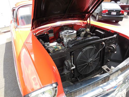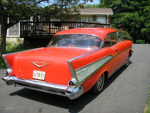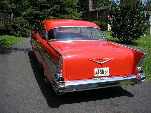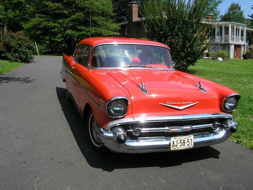 AN AUCTION FOR A NICE 57 CHEVY .DRIVER . APPOX 1000 MILES ON REBUILT NOM 283 CAR WAS ORIG. 283 4BBL PG. CURENT 283 IS 1960 . WITH 700-R OD TRANS . HAS AFTER MARKET A/C P/S P/B . DULL EXHAUST . ORIGINAL STYLE INTERIOR .57 SPINNER WHEEL COVERS . RADIAL TIRES . CROME IS NICE DRIVER QUALITY . STOCK 57 REAR AXEL . BRAKES STOCK WITH ALL NEW BRAKE CYL,S HAS HAD ONE PAINT JOB APPOX 30YRS OLD. HAS CHIPS & NICKS & SOME AGE CRACKS . STILL HAS GOOD SHINE . HAS SOME RUST IN BODY MOUNTS & SIDE PANELS IN TRUNK.. NEW FRONT SWAY BAR . DRIVES EXCELLENT .A AM LISTING THIS FOR A FRIEND THATS 85 YRS. OLD . CAR HAS BEEN KEPT IN GARAGE FOR LAST 40 YEARS . OWNER IS RETIRED MECHANIC & PIC,S SHOW CAR IN DIRTY CONDITION . A 500.00 NON REFUNDABLE DEPOSIT IS REQUIRED WITHIN 48 HRS .. CAS VERY DRIVEABLE & WILL GO ANYWERE . CAR WILL HAVE TO BE PICKED UP IN FALLSTON MARYLAND THANKS FOR LOOKING .