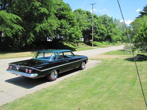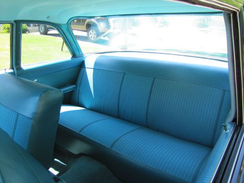 1961 Chevy Bel Air 2 dr. Sedan. Got car in a trade. Recent restoration. Straight body painted black with green top. Trim appears to have been polished and straight. Bumpers could use a rechrome, they are straight and dent free. Good for a driver. Turquoise interior with new seat covers, headliner, carpet and package tray. Door panels and kick panels also appear new. Car has Corvette rally wheels with Mickey Thompson red line tires. Car is very well detailed. During restoration front passenger floorboard was replaced. All lights and gauges work. As does wipers and heater. Rear tail lights have been converted to LED. Cars only needs are radio, it does not work and needs a speedometer cable (it jumps).