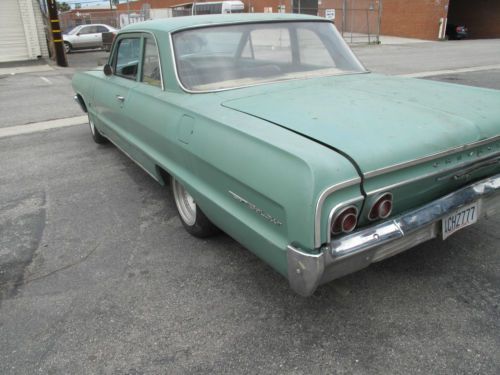 1964 CHEVY BEL AIR WITH 327 AUTO TRANS. PULLED THIS CAR OUT OF GARAGE IT HAD BEEN SITTING FOR WHILE. OWNER SAYS IT HAS REBUILT 327 EDLEBROCK 4 BARREL CARB, CORVETTE CAMEL BUMP HEADS DUAL FLOWMASTER EXHAUST WELAND IMTAKE MANIFOLD CENTER LINE RIMS. THE BODY IS IN GOOD SHAPE FOR A 50 YEAR OLD CAR FLOORS LOOK GREAT TRUNK HAD SMALL REPAIR DONE. RUST OF BODY LOOKS GOOD . DENT IN REAR BUMPER MISSING HEADLIGHT TRIM. INTERIOR IS COMPLETE BUT DATED DASH GAS NOT BEEN CUT. ORIGINAL RADIO TRIED STARTING CAR IT FIRED UP FOR A SECOND COULD NOT GET IT TO TURN OVER AGAIN MAYBE STARTER NOT SURE SO ENGINE CONDITION IS UNKNOWN HAVE TITLE AND KEY LOOKING TO MOVE THIS CAR QUICK NEED SPACE CAN HELP OUT WITH SHIPPING WORLDWIDE YOU CAN CALL ME AT 310 990-8628 IF YOU WOULD LIKE TO VIEW, PRICE IS FAIR CONSIDERING THIS IS NOT SOME RUST BUCKET FROM THE NORTH .IT IS NOT A SHOW CAR BUT A GREAT CANVASS TO START FROM I CAN HELP LOAD ONTO A CAR CARRIER CLEAN TITLE IN HAND. PLEASE CALL WITH ANY QUESTIONS SOLD AS IS NO WARRANTY |