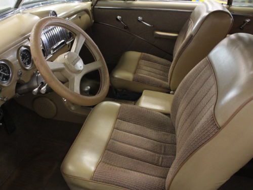 You'll find a much more substantial makeover inside, where bucket seats and a custom center console give the conservative Chevy a much different outlook on life. The custom power buckets are upholstered in handsome fabric and vinyl that might have come from the original fabric samples book in 1950. A fat steering wheel is actually an OEM piece that looks right at home atop a tilt column, and the beautifully stitched door panels have a sweeping bit of trim that gives it a true 1950s flair. The center console somehow looks like it could have been born there, and houses controls for the Vintage Air A/C, shifter, and AM/FM/CD stereo. Stewart-Warner instruments fit neatly into the 1950 instrument panel, with auxiliary gauges fitted into custom housings right below an accessory clock. The headliner is highlighted by gorgeous chrome ribs, and even the trunk is beautifully finished with custom carpets and side panels.