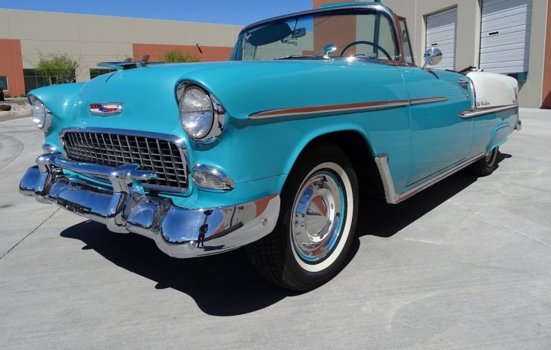 Email me at : brubacherghansjarg@gmx.de Iconic 1955 Chevrolet Bel Air convertible for sale is the epitome of why the Tri-Five Chevys are so popular and have been for many years. This one's been beautifully restored and has the classic '50s colors of Regal Turquoise and India Ivory with a white top. The interior is a complementary two tone turquoise and white. The undercarriage and engine compartment are nicely detailed and show well. The most desirable feature of this convertible is the one-piece bumpers. Buy this sweetheart right now just in time to enjoy top-down motoring throughout the spring and summer months.