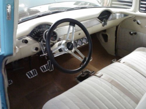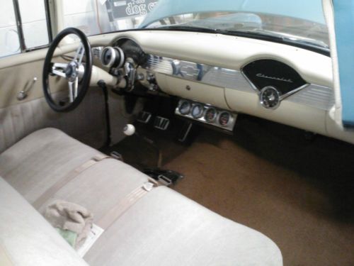 1956 chevy 150 sedan, has a 350 4bolt main, crane cam, supercharged, m-20 munice 4-speed ,lakewood bell housing , 3 inch exhaust, 373 richmond gears, auburn posi, 2 inch dropped spindles and rear blocks, sway bars front and back, disc brakes front and drum rear, the car was done in 2004 paint good and so is the glass.interior color is beige and in good shape.good running car.