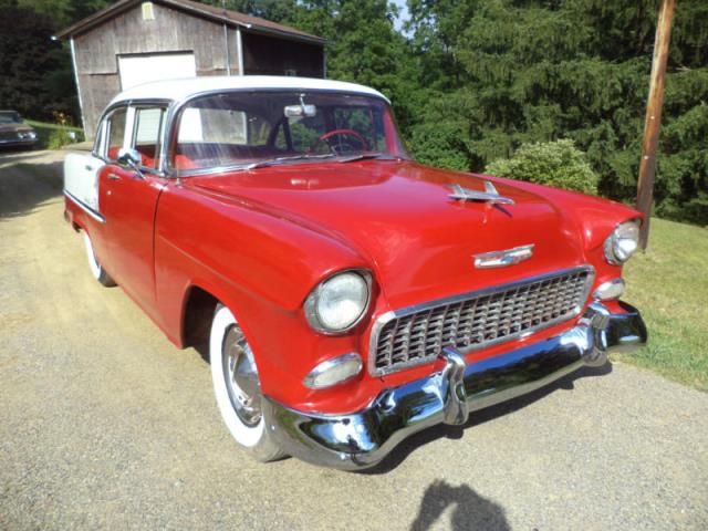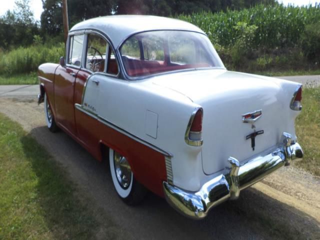 1955 Chevrolet Bel Air four door sedan. Good condition, runs and drives good. Original 235 6 cylinder with 2 speed powerglide automatic transmission. Body is in overall good shape. Solid floors and trunk floor. Rocker panels are solid. Frame is also solid and straight. Small dent in drivers door. Stainless steel trim is nice. Bumpers are near perfect. All glass is good. Interior and door panels very nice shape. Lights and turn signals work good. Will need new tires and rear brakes.