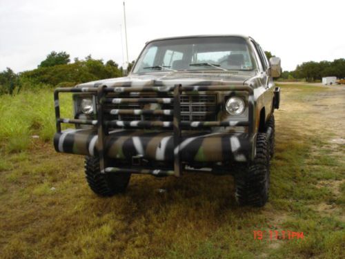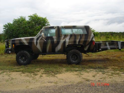 Great Hunting Vehicle Or Just A Toy! Dual Rancho 3000 Shocks in Front & Single 9000 Rancho In Rear. Heavy duty 3 Reciever Basket(Line X Coated)on rear that holds fullsize 4 wheeler(Side rails are the ramps). Small Block Chevy. Custom Camo Paint Job. Factory Roll Bar. Front and Rear Sway Bars. Custom Built Front Full Replacement(Line X Coated)Bumper. 35 X 13.5 Mickey Thompson all around. MUST SEE TO APPRECIATE!! FULLY LOADED !!