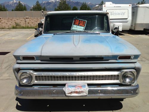 For Sale, 1964 C-20 long bed NOT a C-10 no option on Ebay for a C-20 Chevrolet pick up. I am the 3rd owner and my Dad was the 2nd. It came original with a high torque 283 V8, later it was replaced with a 327 V8 out of a 1969 Chev Impala. At the time of the engine swap a new clutch was installed. Starts and runs and drives with no problems, However due to the engine swap the RPM's in the last gear run high, 55mph or 60mph is the fastest it can manage without over revving engine. Different Trans or rear end might be the answer. The truck has been a Utah truck, so harsh winters means lots of salt which equals rust. Doors, floors, bed, rockers and tailgate all have rust and bondo. This is a labor of love or a great Rat Rod project. Brakes are drum front and back. It has a 4 speed manual transmission, however 1st gear is a grandma gear (not used in everyday driving). Someone installed extra fuel tanks but I don't think they are usable, I had plans to remove them but never did. It does still have original fuel tank behind seat, and that is the one to use. Gas gauge does not work, all other gauges do work. High beams don't work might be the switch or head lights themselves. Regular headlights work fine. Heater works well and I did buy new cables and levers for the heater controls from LMC Truck. I never installed them and if I can find them, I will throw them in for new owner to install (no guarantees). This truck being a C-20 or 3/4 ton also has overload springs on the rear. Wood in bed is original. I just put in a new battery, your welcome!! I bought new tires and wheels several years ago tires only has a few hundred miles on them, however they are old in age. I have had the truck garaged since I got it and just recently moved it out due to a different truck needing the garage. Glass is in good shape and I had the windows tinted by a professional. No radio, power steering or air conditioning. Its not currently registered so I don't like to drive it far, with that being said SHIPPING IS ALL UP TO YOU. If you have questions just call me, Its hard enough buying a vehicle on the internet with a few pictures and a brief description! Bart (801) 514-5738