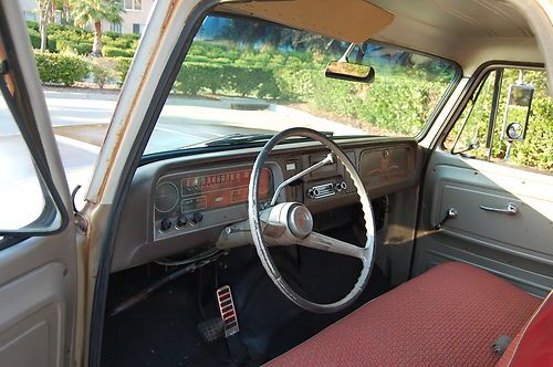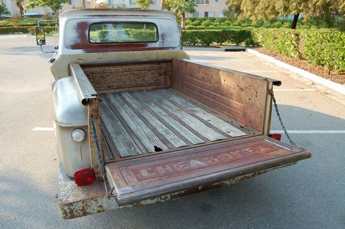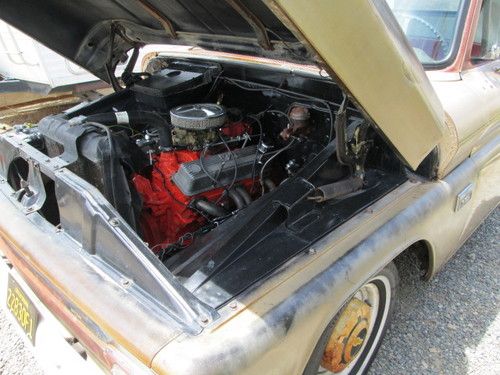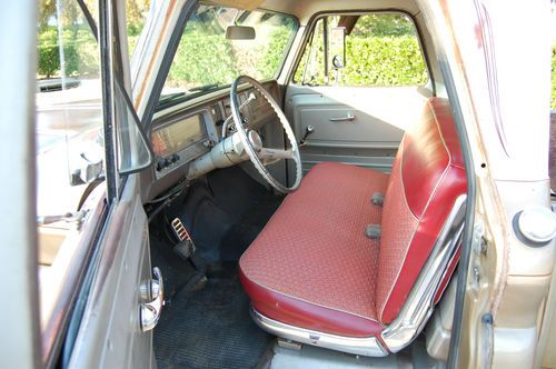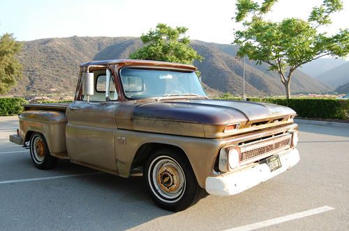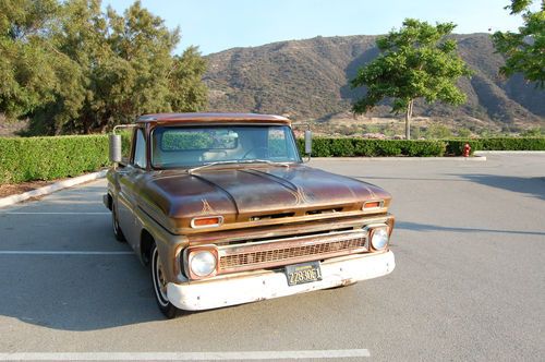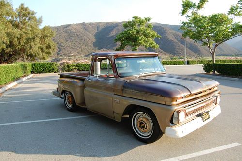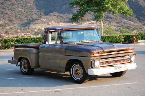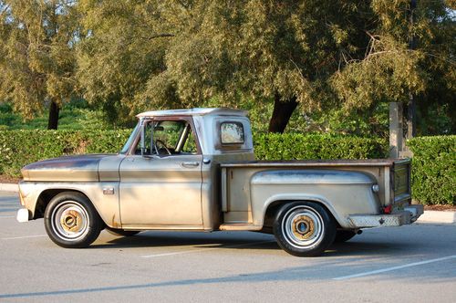 This is my 1966 Chevy short bed truck. Its a very solid old truck with a cool patina through out. The floors and cab are Solid. Small amount of rust on the driverside front lower fender but very minor. The Truck spent its intire life in the dry California desert and stayed very rust free. It has a 350 engine and auto trans with dual exhaust. The interior is nice with an uncut dash and doors. It even still has the originaI radio. I recently installed a new windshield and seal. The truck bed is also rust free and still has the original wood floor. Please feel free to have the truck inspected by a mechanic or third party or just stop by and see it for yourself. Because of its age it will be sold AS IS. Although the truck is very unique its 47 years old and not perfect so do any inspections before bidding. If you have any questions or require any additional picture please feel free to email me. All out of state and over seas bidder are welcome. I will help any way I can with delivery to a local shipper. THANKS AND GOOD LUCK.