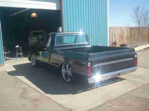 I'm selling my 67 chevy truck it has fuel injected 350 LT1 with a 100 miles on reman,4l60e tranny, 10 bolt possi rear end with 308 gears, AbS BRAKES DRILLED SLOTTED ROTORS 4 WHEEL DISC,coil springs front and rear, sway bar front and rear, ply gas tank under rear of bed. A/C and heat, cruz control, oil cooler, tranny cooler, 2 inch drop spindles, 1/4 inch thick bed floor for smooth ride, Brand new bed sides and tailgate and front bed pannel, GAS FILLER IS BEHIND DRIVERS TAILLIGHT, wheels are Brand New Boss 18x9.5 in front and 20x10 in rear, new Hankook tires, All new leather int done by Dan at Bitchin Stichin,new gauges ,new dash bezel new dash pad, new glass thru out and stainless trim, new billet leather banjo half rap steering wheel,new bodywork and custom paint job, shaved cowl and stack pockets, custom headlights with turn signal in them, new billet grill, new bumpers, 3 inch Flowmaster exhaust, This truck is super fast and smooth, drives like a dream., This truck was built in my shop Weld County Kustomz, THIS TRUCK IS ONE OF A KIND!!! DON'T MISS THIS ONE, call Joe at 303 877 5903