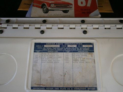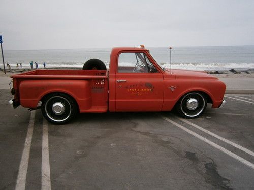 1967 CEVY C10, PATINA SHOP TRUCK. FRESH BUILD WITH LESS THAN 1,000 MILES SINCE DONE. THIS WAS A ONE OWNER ALL STOCK 6CYL .3 spd. GRANDPA TRUCK FROM ARIZONA. 100% RUST FREE, THANKS TO THE FACTORY UNDERCOAT AND ARIZONA DRY WEATHER. IT HAS BEEN REPAINTED ONCE BACK IN THE 80s TO THE ORIG. COLOR RED. NOW HAS A GREAT PATINA LOOK FROM THE ARIZONA SUN AND A LITTLE HELP FROM THE BODY SHOP. VERY STRAIGHT BODY WITH THE EXCEPTION OF A COUPLE SMALL DINGS (REAR OF LEFT REAR FENDER) IT HAS PAINTED SHOP SIGNS ON BOTH DOORS FROM A SPEED AND MARINE SHOP IN THE 60s-70s.IT HAS SOME HOLES DRILLED IN THE BED SIDES FROM WHEN IT HAD A SMALL CAMPER SHELL ON IT AND THE HOLES WERE DRILLED FOR VENTALATION.ORIG. WOOD IN BED IS VERY GOOD COND. THE OWNER WAS A BIG RIG DRIVER AS YOU CAN TELL FROM SOME OF THE FACTORY AND DEALER OPTIONS, LIKE THE ROOF MARKER LIGHTS AND SPOTLIGHT AND I DO HAVE THE ORIG. SMALL RV MIRRORS. THE MECHANICAL RESTORATION STARTED WITH PULLING THE FRONT CLIP. AND STRIPPING THE FRAME BACK TO THE FIREWALL.FRAME WAS CLEANED AND PAINTED, ALL NEW CPP, FRONT SUSPENSION WITH DROP SPRINGS AND DROP SPINDLES WAS ADDED WITH POWER DISC BRAKE CONVERSION AND LATER MODEL POWER STEERING. ALL THE REAR SUSPENSION WAS REMOVED , CLEANED AND POWDER COATED, WITH ALL NEW CPP BUSHINGS AND LOWERING SPRINGS. REAR END WAS REBUILT WITH NEW BEARINGS AND SEALS. THE MOTOR IS A 350 4 BOLT MAIN 30 OVER WITH FLAT TOP PISTONS, COMP CAMS THUMPER CAM AND LIFTER KIT. (NICE LITTLE RUMPY CAM). NEW ALUMINUM RADIATOR,NEW FUEL TANK, REBUILT TURBO 400 TRANS WITH B&M SHIFT KIT. ALL NEW HIGH END FLOWMASTER EXHAUST SYSTEM, SOUNDS REALLY GOOD!!! ALL NEW INTERIOR, LOOKS EXCELLENT. THE WHEELS ARE 20" POLISHED CENTERLINES WITH THE CENTERS PAINTED SATIN BLACK AND DOG DISH CLIPS AND HUB CAPS.THE YOKAHAMA TIRES AND CENTERLINES WERE WELL OVER 4k ALONE. THE TRUCK RUNS VERY STRONG, ALWAYS RUNS COOL. DRIVES SUPER NICE, TIGHT AND SMOOTH. PLEASE FEEL FREE TO ASK QUESTIONS. IF YOU ARE NEW TO EBAY AND HAVE ZERO FEEDBACK YOU MUST CONTACT ME BEFORE BIDDING OR I WILL CANCEL YOUR BID.ALL SHIPPING AND TRANSPORTING IS UP TO BUYER. THIS IS A VERY KOOL HOT ROD SHOP TRUCK READY TO DRIVE. ALSO I NEED TO MENTION THE SHIFTER IS NOW LOCATED ON THE EMERGENCY BRAKE HANDLE WITH B&M CABLE DRIVE. VERY EASY TO USE! LOTS OF TIME AND $$$ SPENT ON THIS BUILD.