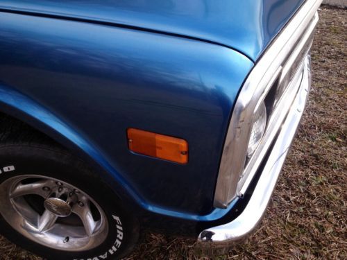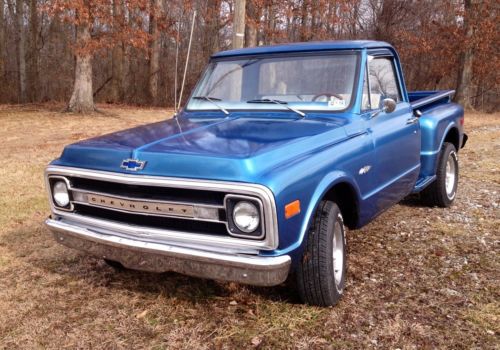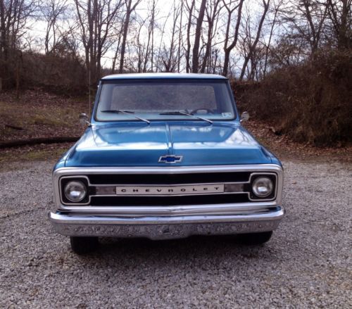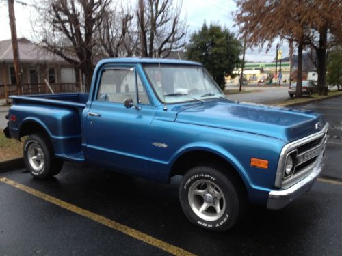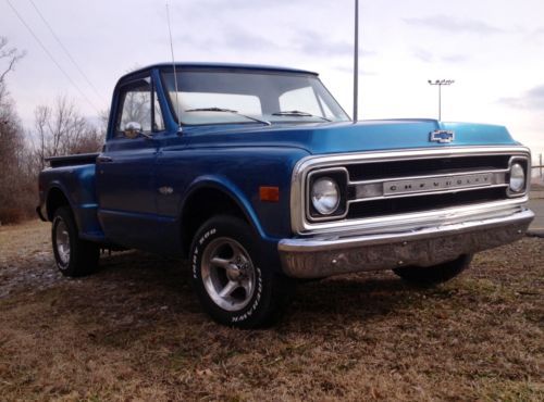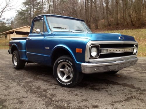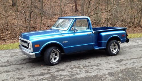 69 c10 2wd 350 auto. Truck is not a show truck but a nice cruiser. Runs and drives fine. Has a 350 with accell distributer, edelbrock 600 carb, Holley street dominater intake. Aluminum radiator with electric fan. Dual exhaust. Power 4 wheel drum brakes. Power steering. Drive this truck daily. (Weather permitting) truck is a great driver. Little work could be show worthy. Has a few bubbles in lower pass. Door and paint chipped around one of the rear markers. Windshield is a little milky around edges. Wipers, turn signals, horn all work. Fuel gauge does not. I'm sure it needs a sending unit. Any questions please feel free to ask. If you want pics of something ill be happy to get them and again this is not a show truck and is not priced as one but its a great driver that gets lots of attention. Please inspect and ask all questions before auction end. Thanks!!!