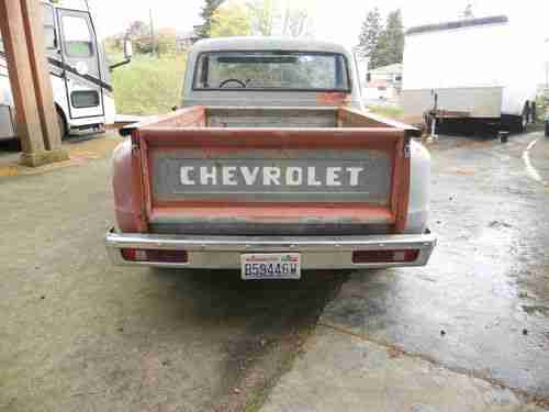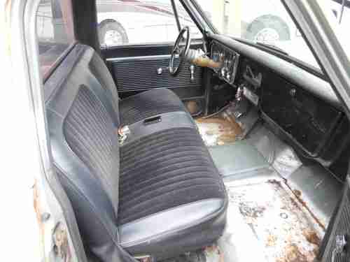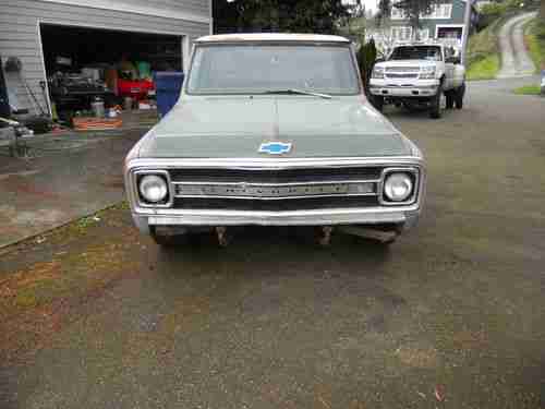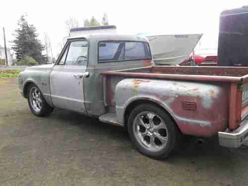 1969 short bed stepside truck 350 with 350 auto and 411 gears. Truck has usual rust, both rocker panels and cab corners should be replaced in my mind. They is also some rust in kick panels. Very thing works heat, horn, lights and ect. I also have for it a tilt column and newer truck steering wheel and two good 1972 doors because there is 6x9 speaker holes cut in bottom of doors that are on the truck now. The bed is in very good shape and someone replace the floor with a solid piece of 3/8 of aluminum and tailgate is very nice also. Truck runs, drives good but I think it needs power brakes. I driven it allot with no problems at all. It has 20 inch wheels also but tires are about at the end of there life.