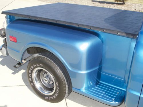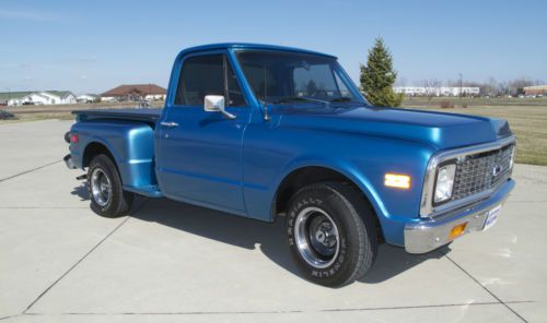 Like this truck? Make an offer ! This is a highly desirable and rare 1972 Chevy C-10 stepside short box truck. It's nicely restored, with a very nice base coat/clear coat paint, brand new oak bed, and a strong 350 CID V8 (later model engine, appears to be a 1992 with an Edelbrock intake and carb setup) and smooth shifting automatic transmission. I bought the truck in Palm Springs, California this winter, and spent the winter enjoying driving it all around the desert. It was a super daily-driver for my winter "snow bird" cruising. Everywhere you go with this truck, people react with a smile and a wave. It cruises smooth and straight down the road. It shifts smooth, power steering and brakes work great. This Chevy required very little sorting on my part, which is a bit unusual with collector cars. I replaced a valve cover gasket, and a few little details here and there, along with adding a new water pump (the day before loading it on the auto transport semi, the water pump seal failed and leaked coolant, so I had my mechanic in California install a brand new water pump). Drives and rides like a much newer truck - very fun to cruise in, with a whole lot of power and performance on tap. The new turbo mufflers give it a throaty growl. Check out the brightwork on this truck, its in excellent shape - much of the trim, bumpers, etc. seems to have been replaced with aftermarket trim. Very nice! Additional Specifications