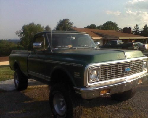 1972 CHEVY K-10 4X4 SHORT BED 4 SPEED.GOOD SOLID TRUCK.NO FLOOR RUST,NEW ROCKERS.BOTH REAR CAB MOUNTS PERFECT,FRONT MOUNTS JUST A COUPLE SMALL SPOTS ON EACH ONE.CORNORS OF BOTH DOORS HAVE RUST BUT CAN BE EASILY FIXED. SOLID CAB CORNORS.NEW DASH PAD,BED FLOOR GOOD AND SOLID.BUT NEEDS BOTH OUTER BED SIDES.NEW CLUTCH AND PRESSURE PLATE.4WD WORKS PERFECT.TRANS SHIFTS GOOD AND TIGHT.3'' LIFT.POWER STEERING,POWER DISC BRAKES.MOTOR IS A 1966 CORVETTE 327 REBUILT WITH AROUND 20,000 MILES ON IT,ALL STOCK.NEW ELDEBROCK CARB.EVERYTHING WORKS.NEW VA STATE INSPECTION STICKER.ANY QUESTIONS CALL ALLEN 540-493-6759