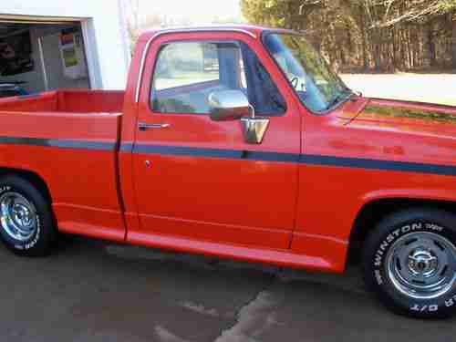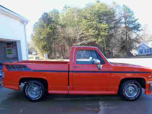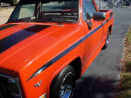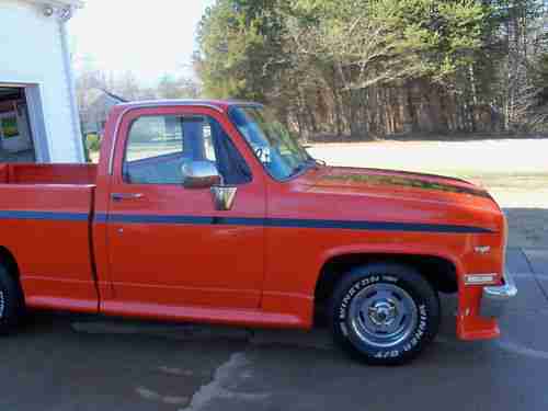 1986 chevy custom cab truck runs and drives great very reliable daly driver air conditioning, nice interior, power disk brakes power steering, body straight totally rust free always garaged no dings no dents competition orange with painted on black strips. 15 inch rally wheels perfect condition.V8 4bbl new holley 600 vac sec. new edelbrock performer intake new 202 heads stainless steel valves high performance valve springs and hardened keepers. skew in rocker studs,guild plates, roller rockers and locks all new. new voodoo cam and lifters new timing chain. long tube headers, flow master exhaust. new billet distributor new radiator,hoses, belts, water pump, fuel pump,trailer hitch 5000 lbs transmission completly rebuilt and new torque convertor any questions call 704 987 2219 ASK FOR CHRIS. QUESTIONS WILL BE ANSURED BY PHONE ONLY NO EMAILS ANY RESONABLE OFFER WILL BE CONSIDERD.