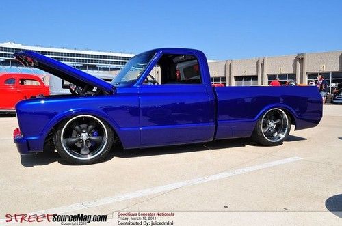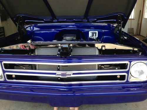 1967 Chevy C10 Custom Built by Scott Garage, 350 V8,Crane cam 280/486, Edelbrock 1406 carb, Weiand 7547 intake, Mallory dist, Hedman headers, Custom radiator, programmable fan control, Custom aluminum fuel cell, Holley fuel pump, 700r4 auto trans, Front and rear disc brakes, Wilwood master cylinder, custom duel trans coolers, 12 bolt with eaton posi, air ride front and rear, four corner separation, triangulated four link rear suspension, custom bench seat, custom door panels, custom console, Ididit steering column, power steering, custom fabricated turn signals, Shaved doors, bed, rain gutters, antenna, cab seam, welded in roll pan, ride tech shocks, hid headlights, dual custom exhaust, door poppers, power windows with remote, Billet specialties steering wheel, classic instruments custom gauge cluster, dual sound deading, tubbed bed, Coys custom wheels 20x8front 20x10 rear, Yokohama 255/40R20 front tires, Yokohama 275/40R20 rear tires, Laser Blue custom paint. Truck is ready to show and drive.
