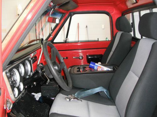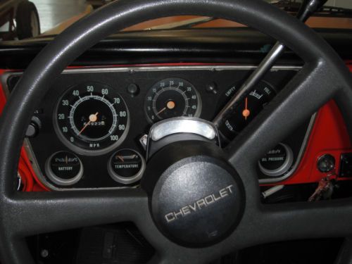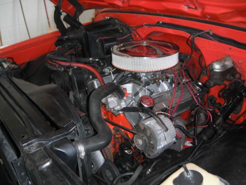 1970 SWB stepside with A/C. The engine is a mildly built 327 with double hump heads, HEI distributor, Edelbrock Perormer intake and 4 bbl carb. Originally a stick but now has a 350 turbo with a shift kit. Exhaust is through headers and dual pipes out the back. The brakes are drum but do the job smoothly. 20 inch Boss 6 lug wheels and Goodyear tires. The interior is very good except some scratches on the doors in the paint and the dash is cracked. Seats are out of a 2011 Silverado. The stereo is a new Pioneer CD player. The electrical is good except the backup lights, tach, and voltmeter do not work. The clear coat is coming off and the truck will need paint soon but no bodywork should be needed. The bed is a single piece of plywood but I have the rails to put boards in. The rear end is a 12 bolt with low gears.
