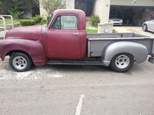 I AM SELLING MY 1954 CHEVY TRUCK THAT RUNS AND DRIVES. HERE WE GO, THIS TRUCK HAS A LATE MODEL 350 CHEVY ENGINE WITH A 700R4 TRANS . I HAD THE DRIVE SHAFT CUT AND BALANCED SO NO VIBRATIONS ! THE REAR END IS A 10 BOLT (NO POSI)THAT HAS BEEN TOTALLY REBUILT , SEALS , BEARINGS , WITH ALL NEW DRUM BRAKES IN THE REAR . THE TRUCK HAS A SPEEDWAY DISC BRAKE SETUP IN THE FRONT , BRAND NEW ! IT ALSO HAS BRAND NEW BRAKE LINE FRONT TO REAR , (STOPS ON A DIM)!!! IT HAS A SPEEDWAY MASTER CYLINDER KIT THAT IS MOUNTED ON THE FRAME RAIL( CLEAN SETUP). THE TRUCK HAS ALL LIGHTS IN WORKING CONDITION , HEAD LIGHTS , BRAKE , SIGNALS ALL WORK . THE INSIDE OF THE TRUCK IS WHITE IN COLOR (NOT PERFECT) . THIS IS A VERY GOOD RUNNING TRUCK. I HAVE A 5 GALLON FUEL CELL IN THE BED, IT WOULD REALLY NEED A BIGGER GAS TANK ! ALSO NEEDS A FLOOR IN THE BED OF THE TRUCK , OTHER THAN THAT IT IS VERY SOLID !