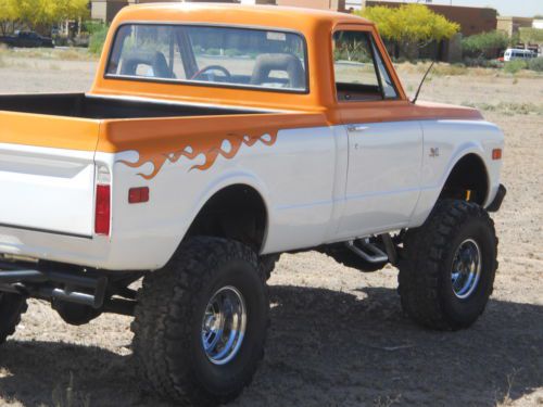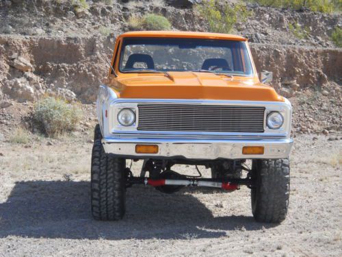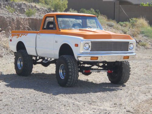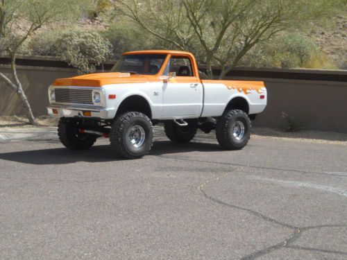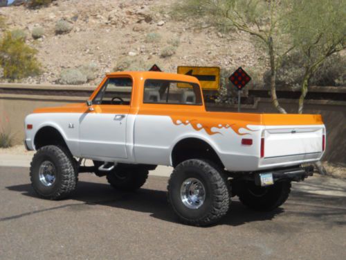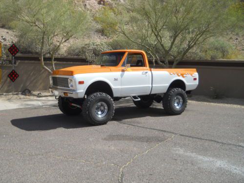 FIRST OF ALL IT HAS BEEN STATE INSPECTED AND ISSUED AZ VIN THUS BEING A RECON TITLE.I DO HAVE THE INSPECTION SHEET FORM THE AZ STATE DEPARTMENT OF MOTOR VEHICLES WHICH STATES SO TO PROVE IT. IT IS LISCENSED IN MY NAME, TITLE IS CLEAR AND INSURED AND DRIVEN JUST ABOUT EVERY DAY. IT RUNS FANTASTIC ,VERY FAST AND A BLAST TO DRIVE(MAJOR ATTENTION GETTER). THE PAINT IS BEAUTIFULL BASE CLEAR JOB(,HAVE THE COLOR CODES AND EXTRA PAINT) BUT HAS A FEW IMPERFECTIONS AND LITTLE CHIPS HERE AND THERE FROM BEING DRIVEN AND NOT JUST SITTING. THE BODY IS VERY STRAIGHT AND DOORS,2" COWL HOOD , TAILGATE ALL LINE UP AND SHUT NICE. WINDOW GUIDES, FELTS, DOOR WEATHERSTRIP, RUNNERS, REGULATORS ALL REPLACED . CARPET, HEADLINER, DOOR PANELS ALL MATCH, NICE CUSTOM STEERING WHEEL, ALL DOOR LOCKS AND IGNITION ARE ONE KEY OPERATION, ALPINE HEAD UNIT WITH MATCHED AMP AND SUBS, MIDS WHERE THE FACTORY TANK USED TO BE BEHIND THE SEAT. NOW A NEW TANK AND SENDING UNIT UNDER THE TRUCK WITH ACCURATE READING GAUGE, CUSTOM INSTURMENT BEZEL WITH ALL AUTOMETER GAUGES THAT WORK AND ALL LIGHTS WORK THIS TRUCK ALSO HAS POWER DISK BRAKES ALONG WITH POWER STEERING.. SUSPENSION IS ALL TIGHT WITH NEW POWER STEERING GEAR BOX, PITMAN ARM AND HUGE SWAY BAR AND IT REALLY HELPS. MOTOR IS A BIG BLOCK 454 WITH 049 LARGE OVAL PORT OPEN CHAMBER HEADS. PERFORMANCE CAM WITH MATCHED SPRINGS AND LIFTERS. EDELBROCK PERFORMER R.P.M. MANIFOLD FED BY A 750 HOLLEY DOUBLE PUMPER WITH AN H.P. MAIN BODY, 60K VOLT HEI IGN SYSTEM, SOLID CORE WIRES, NEW STYLE MINI HIGH TORQUE STARTER, FULL LENGTH HEADERS 3" MANDRELL BENT EXHAUST THRU FLOWMASTERS. 4 ROW DESERT COOLER RADIATOR WITH FLEXALITE TWIN ELECTRIC FAN POD COOLS THIS BEAST.110 AMP CHROME 1 WIRE ALTERNATOR CHARGES IT AND HAS A NEW LATE MODEL WIRING HARNESS AND AS I STATED EARLIER EVERYTHING WORKS. TRANS IS A HIGH PERFORMANCE BUILT TURBO 350 WITH HEAVIER SPRAG, SUN GEAR, LARGER CLUTCH PACKS, SHIFTS SOLID. AS FAR AS THE GEARS I BELIEVE THEY ARE 373'S , LIKES THE FREEWAY BUT HAS A LOT OF BOTTOM END EVEN WITH THE 36/14.50 PARNELLI JONES MUD TIRES.(VERY AGRESSIVE TREAD PATTERN AND LIKE NEW),TRANSFER CASE IS A TIGHT NP203 THAT SHIFTS FROM LOW TO HIGH AND 2 TO 4 WITH EASE AND HAS LOCKING HUBS MY RESERVE IS EXTREMLY LOW AND IF YOU WILL READ MY FEED BACK ANYONE WHO HAS EVER PURCHASED A VEHICLE FROM ME HAS BEEN MORE THAN HAPPY AS I TELL IT LIKE IT IS. PLEASE FEEL FREE TO ASK ANY QUESTIONS YOU MAY HAVE BUT BE SERIOUS AND HAVE THE FUNDS BEFORE YOU BID AND IF YOU WOULD LIKE TO HAVE IT INSPECTED DO SO EARLY IN THE AUCTION. IF YOU HAVE LESS THAN 2 FEEDBACK AND ANY NEGATIVE PLEASE EMAIL ME BEFORE BIDD