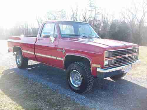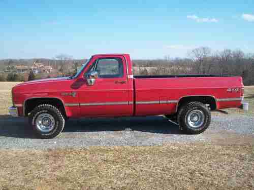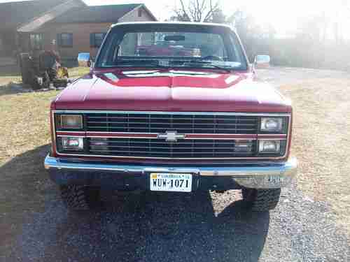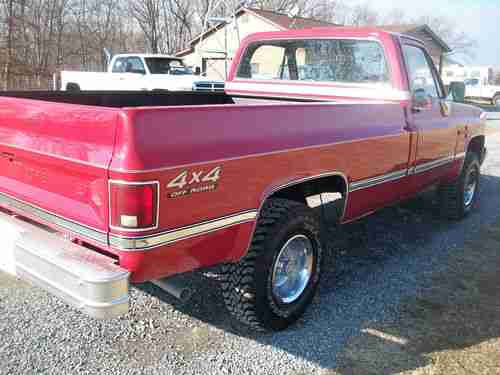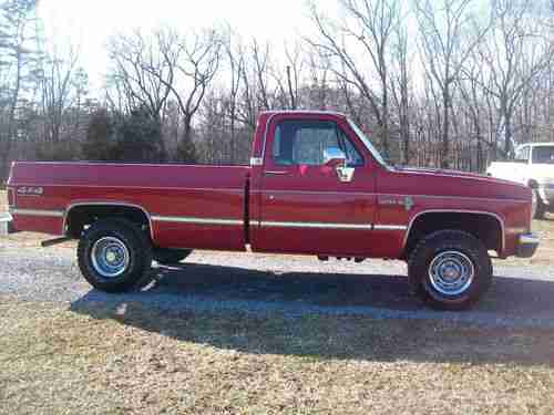 FOR SALE IS MY 1984 CHEVY TRUCK 1500 4X4 350 V8 4 SPEED THIS TRUCK HAS LOW MILES ONLY 135 K THIS TRUCK RUNS AND DRIVES GREAT!!! IT HAS JUST BEEN FRESHLY PAINTED . IT HAS ALL NEW CHROME SIDE MOLDING NEW PIN STRIPING NEW 4X4 DECALS NEW DUEL EXHAUST NEW FRONT BRAKES NEW REAR BRAKES NEW FRONT AND REAR SHOCKS NEW GAS TANK NEW GOODYEAR WRANGLER AUTHORITY'S 31X10.50X15 TIRES NEW WHEEL WELL MOLDING'S NEW FRONT BUMPER NEW GRILL NEW HEAD LIGHT BUCKETS NEW BATTERY NEW STAINLESS STEEL ROCKER KICK PLATES NEW DASH NEW SEAT NEW CARPET . THIS TRUCK HAS FACTORY RALLY WHEEL'S THAT HAVE JUST BEEN REPAINTED WITH NICE BEAUTY RINGS . FOR ANY OTHER QUESTIONS JUST SEND ME A MESSAGE OR GIVE ME A CALL CHAD AT 540-303-6830 THANKS FOR LOOKING!! BUYER IS RESPONSIBLE FOR SHIPPING SALES ONLY TO THE UNITED STATES TRUCK IS FOR SALE LOCALLY SO AUCTION MAY END EARLY IF THERE ARE NO BIDS A 500 DEPOSIT IS DEW WITHIN 48 HOURS OF END OF SALE