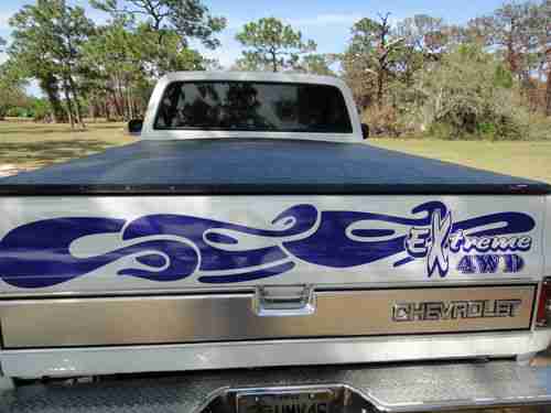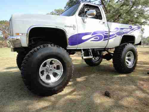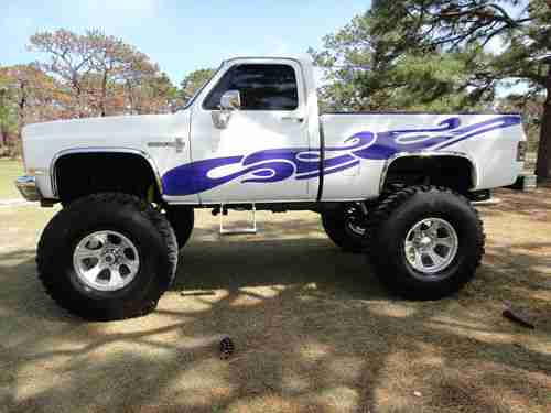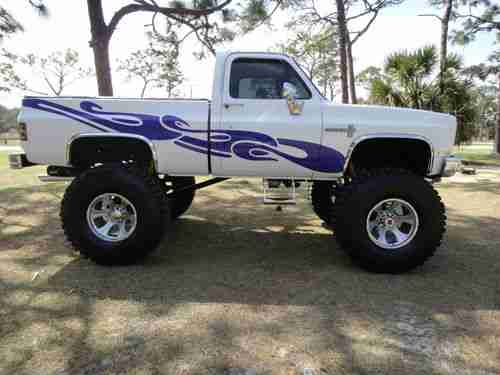 FOR SALE IS MY OUTSTANDING 1987 CHEVY 1 TON SHORTBED FOR ALL YOU BOWTIE LOVERS THE WHOLE TRUCK IS BASICALLY BRAND NEW FRAME OFF I HAVE OVER $25K INVESTED SHE HAS A 12" SUSPENSION LIFT WITH A 3" BODY LIFT HAS BRAND NEW 46" TIRES MOUNTED ON DICK CEPEK 20" WHEELS ALL NEW BRAKES THE WORKS 350 ENGINE REBUILT MILD CAM HAS HEADERS WITH DUAL EXHAUST BOTH FRONT AND REAR GEARS ARE 5.38 DANA 60 FRONT BOTH AXELS COMPLETELY REBUILT KINGPINS BUSHINGS BEARINGS NEW CROSSOVER STEERING 14 BOLT FULL FOATER REAR 4 WHEEL DISC BRAKE CONVERSION TOM WOODS REAR DRIVE SHAFT 203 CAST IRON TRANSFER CASE COMPLETELY BUILT 350 TURBO WITH RACE SHIFT KIT EVERYTHING IN MOTOR IS NEW HOLLEY CARB DISTRIBUTOR STARTER ALTERNATOR,INTAKE EVERTHING IN CAB NEW SEAT DASH CONTROLS ECT CD PLAYER CARPET FIRE EXT PANELS TRUCK BODY IS AMAZING NEW PAINT STORED INSIDE GARAGE USED A COUPLE TIME FOR PARADES NEW STEPS BARS NEW BED LINER SS WINDOW VENTS TINT NEW HEADLIGHTS TAIL NEW CHROME FENDER FLARES NEW SHOCKS THE PURPLE GRAPHICS WERE EXPENSIVE BUT CAN BE REMOVED WITH EASE CUSTOM LIGHT BRAKE BAR IS NEW THE LIST GOES ON SHE DRIVES DOWN THE ROAD VERY NICE ONE HAND NO BS ALOT OF MONEY IN HER HATE TO LET GO AND WILL SURLEY MISS BUT I NEED TO AT THIS POINT AND TIME I DO HAVE ROLLERS (SMALL WHEELS TIRES COMBO ) TO GO ON THE TRUCK SAVE ALOT OF MONEY TRANSPORTING THEY ARE INCLUDED SHE WILL DRIVE ANYWERE.I CAN STORE IN MY GARAGE FOR UP TO 30 DAYS IF SHIPPING AFTER FULL PAYMENT I THINK THIS IS FARE. PLEASE SAVE YOUR TINY OFFERS I MAY ACCEPT TRADES BUT WOULD RATHER GET CASH SHE WILL BE FOR SALE LOCAL IN MELBOURNE FLORIDA HAVE RIGHT TO END AUCTION EARLY GOOD LUCK SHE IS ONE OF A KIND