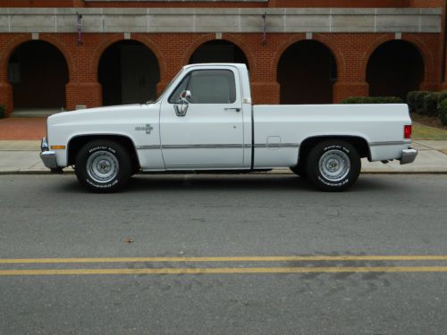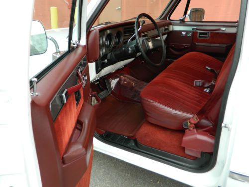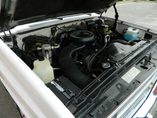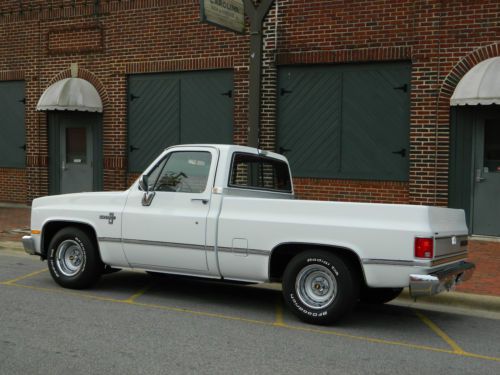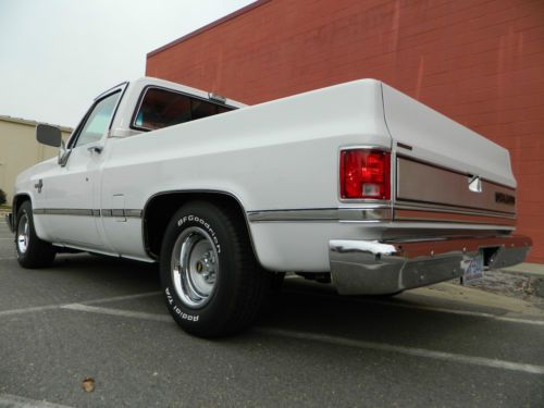 1987 Chevrolet C10 Silverado Shortbed R10 2 wheel drive. Restored stock. White, Burgandy cloth interior, 5.7 Fuel Injection, 700R4 transmission. PS, PDB, PW, PDL, Tilt, Cruise, Cargo lamp, A/C, Clock, dual tanks. Local truck fully restored, no rust ever or collision damage. Right side gas tank does not work. Have not checked out, because don't use anyway. Bedrails have holes drilled for the original GM bedrails included with the truck. Has white vinyl currently over holes. I prefer look without rails. |
