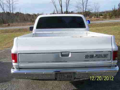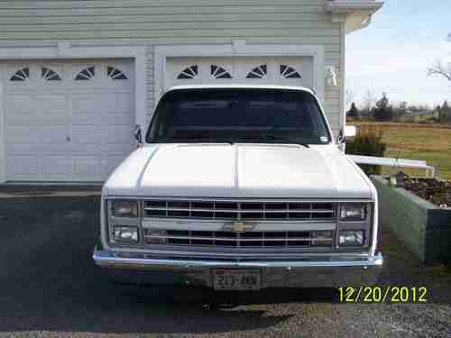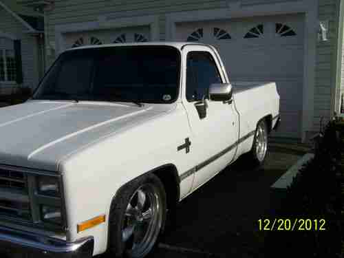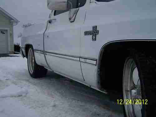 1 1987 chevrolet silverado pickup truck from kansas city, never seen winter, truck needs fresh paint, but still really good for year of truck. truck was bought 2 years ago and imported to canada for $11,000 then invested $2000 in more engine parts. in 2004 the owner paid the dealer to install a gm crate motor and transmission installed by the dealer also. truck has rare beautiful black power interior, torx thrust american racing 20" wheels with toyo tires, bell tech lowering kit 4" and 6", tinted windows, dual exhaust, have brand new flowtech headers in box comes with truck, brand new a/c condenser that needs to be installed then charged. truck dosen't need anything for a safety. dash has 1 crack, maybe replace wheather stripping, fresh paint and would easily be worth over $20,000, this truck with these options and factory 5.7 never been restored before and all the fuel injection complete untouched and working perfect is very hard to find now. truck is very good on fuel, truck has factory dual gas tanks and the left pump needs to be replaced.(tank is full also)