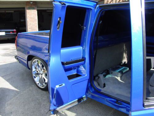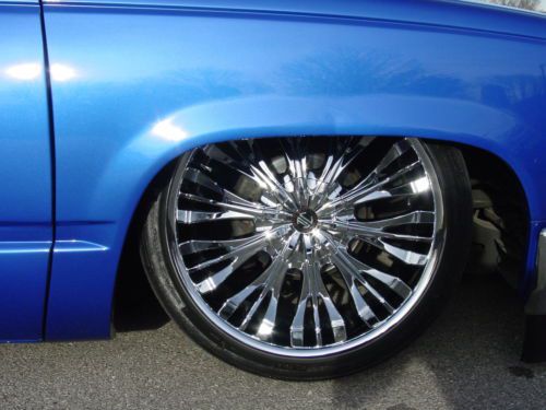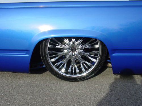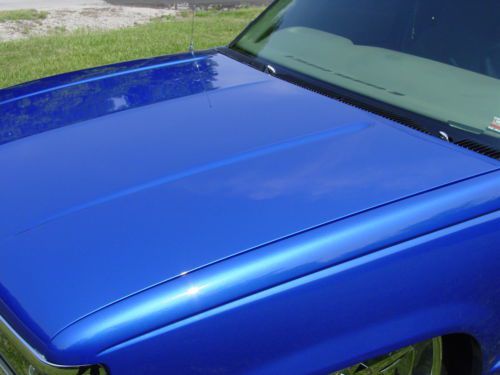 Suspension: KP Components 6 link with panhard bar (color matched to the body) York engine driven compressor 5 gallon tank 1/2" valves Front and Back, All up and All down. Switches are there for side to side, but need to be wired. Frame notch in rear, tie rods notched Interior: Panels have been smoothed and color matched to body (door panels and dash still need to be done) Stock seats Power locks and windows New carpet installed 2 years ago (silver). Exterior: Custom blue pearl Stake pockets shaved Third brake light shaved Ghost line, Chevy bow-tie ghosted in 22" 2 Crave wheels (brand new) Wiper delete 5% tint all the way around (except windshield) |