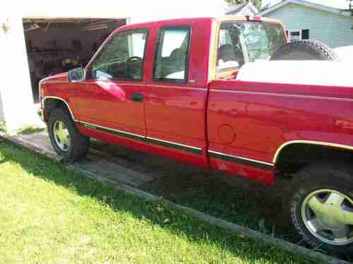 1998 Chevroelt K1500 Silverado. Exteneded cab with z71 package. This is not a new truck, its starting to show its age. Runs great, new starter, aftermarket aluminum distributor(plugs wires cap and rotor at this time as well),new fuel filter, K&N air filter in stock housing,new cam sensor,i installed a reese hitch when I bought the truck, recent intake gaskets, new inner and outer tie rod ends, aftermarket steering stabalizer, recent radiator, windows work great, stereo sounds good, cab corners and rockers are solid. 4wd worked great the few times I've needed it. Trans shifts good and fluid smeels good. Plastic bedliner. I will clean the truck before it sells. It's a little messy right now, but I have a 3 year old son so it happpens. Flowmaster muffler welded into stock exhaust. It exits before the passenger rear wheel. Was like this when I bought it, doesnt leak. Rest of exhaust is stock. Bottom of front fenders behind the front wheels are rusty, strange spot for rust. Minor rust bubbles above the windshield. Starts, runs, drives, and stops as it should. Cosmetically it shines when it's clean, but there are a few dents and dings. The price reflects this. Again, DO NOT EXPECT A NEW TRUCK, NO WARRANTY WHATSOEVER. I shouldnt even have to type this, but theres always that person who wants something for nothing. Im selling because I bought a 1 ton to pull my equipment and do not need another truck just sitting. Ive owned it for a little over a year and it's never failed me.