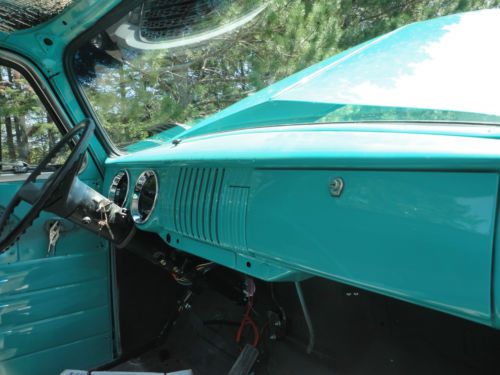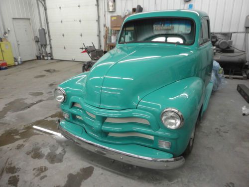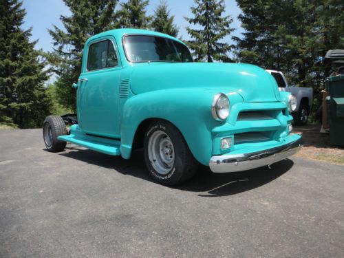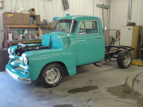54 chevy short bed. Easy project to finish. rebuilt 350 ci with 16,k (have paper work) rebuilt 350 auto 0 miles. New fatman frontend hub to hub assy. with upper and lower tubular a-arms, power rack and pinion, 11" chevelle rotors, EZ wiring harness, tinted glass, Dakota gauges in teal, rear springs and bushing, drive shaft and u-joints, duel master cylinder, brake lines and hoses, B&M shifter (not installed) to much to list. Very solid body. Was taken down bare metal. Finished in base coat clear coat. Rear fenders are straight and in primer. Bed still needs some work. Truck runs great and will drive with shifter and brake fluid. I have near 10k into it and do have receipts for most the parts. Wheel and tires are not mine but I do have some rollers. As is sale. Maybe can deal on 66 2 door hardtop chevelle. No rusty junk. I can be reached at 218-729-7840 Terry