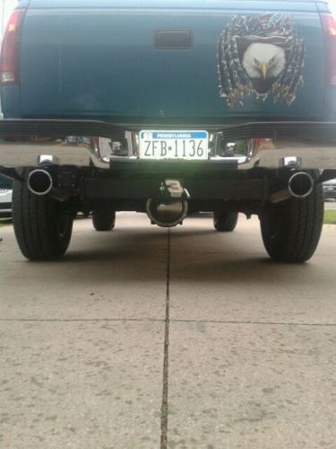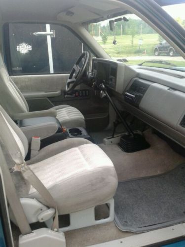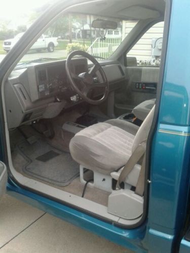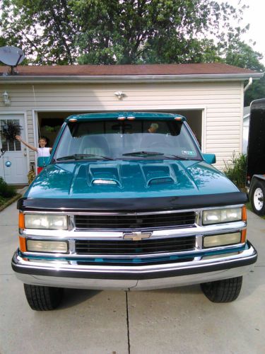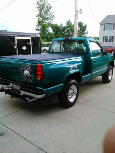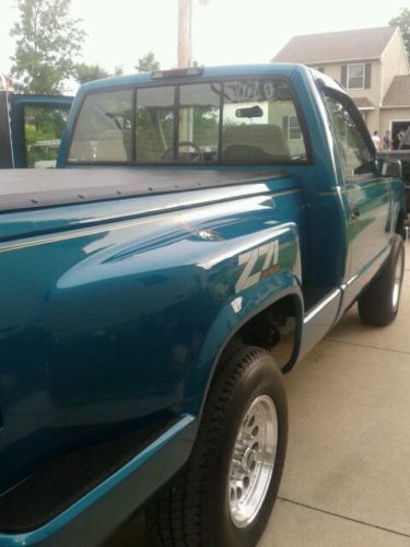 FOR SALE IS A 1994 CHEVY 1500 WITH A STRONG RUNNING 350 5.7 ENGINE.IT IS 4 WHEEL DRIVE AND WORKS PERFECT.THE TRANSMISSION IS A 5 SPEED MANUAL WHICH WAS REBUILT.IT SHIFTS GREAT WITH A NEWER CLUTCH IT DOES HAVE A LITTLE NOISE WHEN PRESSING ON THE CLUTCH IT WAS CHECKED BY GM MECHANIC MONTHS AGO AND SAID IT WAS FINE.THE TRUCK HAS BEEN REPAINTED AND HOOD SCOOPS INSTALLED AND NEW CHROME BUMPERS REPLACED.THE FRAME HAS RAT ROD PAINTED ON IT WITH A PICTURE OF A RAT.ALSO PAINTED TO HOOD SCOOPS IS RAT ROD.CUSTOM EAGLE ON TAILGATE AND BEDSIDE.THE WHEELS ARE NEW ALSO.HAS BUCKET SEATS WITH CENTER CONSOLE AND A CD PLAYER.HAS GAUGES AND TACHOMETER.ALSO INSTALLED IS A SWITCH TO CONTROL ELECTRIC DUMPS ON EXHAUST WHICH IS MUCH LOUDER.THE BED RAILS ARE FIBERGLASS AND THE BODY AND PAINT ARE VERY NICE ESPECIALLY FOR THE YEAR.HAS A TONNEAU COVER AND SPRAYED IN BEDLINER.THIS TRUCK TURNS HEADS EVERYWHERE IT GOES INCLUDING CAR SHOWS.IF YOU HAVE ANYMORE QUESTIONS PLEASE ASK.