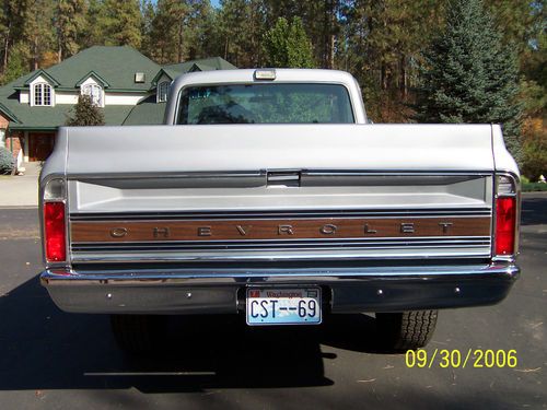 1969 CST (3/4 ton) 4x4 pickup. I purchased this truck in 1973 from original owner and completed a frame-off restoration in 1998-99. It has only 800 miles since restoration, and has been stored indoors since then. Factory silver truck, repainted base coat/clear coat. All exterior moldings were replaced with GM moldings. This is a 350 motor with 350 transmission. This truck is show quality with a beautiful oak bed - the interior is all original with the exception of the seat cover and carpet. The truck has a factory in-dash tach and all gauges work with the exception of the factory AM radio. I have an GM AM/8 track radio that will go with the truck..the radio is complete, but I'm not sure of the working condition. This truck shows well and does not dissappoint. Please feel free to call me with any questions. 509.999.5899.