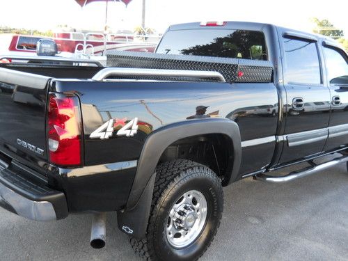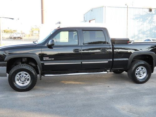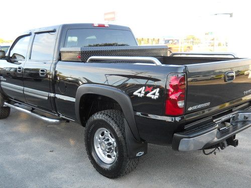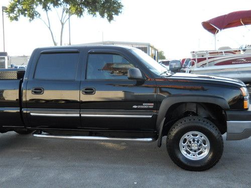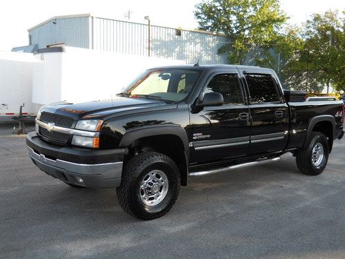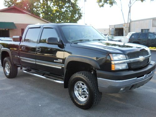 HELLO YOU ARE BIDDING ON A 2004 CHEVROLET 2500 HD CREW CAB LT DURAMAX ALLISON 4X4 BLACK TAN LEATHER HEATED SEATS AM FM BOSE CD POWER EVERTHING DVD IN REAR THIS TRUCK IS LOADED AND VERY VERY NICE SPRAY IN BEDLINER 285 TIRES LEVELING KIT K AND N COLD AIR INTAKE HYPER TECH POWER PORGRAMMER THIS TRUCK GETS 17.5 MPG EVERDAY BETTER ON HIGHWAY NO ISSUES RUNS AND DRIVES GREAT .YHIS TRUCK IS TMU TRUE MILES UNKNOWN THAT MEANS AT SOME POINT THE SPPEDO HAS BEEN CHANGED CALL WITH QUESTIONS AND I WILL BE GLAD TO EXPLAIN GOOD LUCK AND HAPPY BIDDING NADA IS 22000 I WILL LET IT GO FOR ALOT LESS THAN THAT CALL JASON 256 572 9979