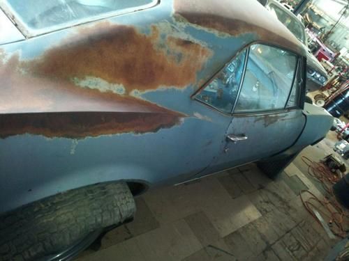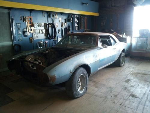 1967 Camaro, factory AC car. Factory Blue on Blue standard interior with a factory console. All the interior is still in the car but will need replaced. The front sheet metal and quarter panels will need to be replaced. Floorboards and Doors are in good condition.