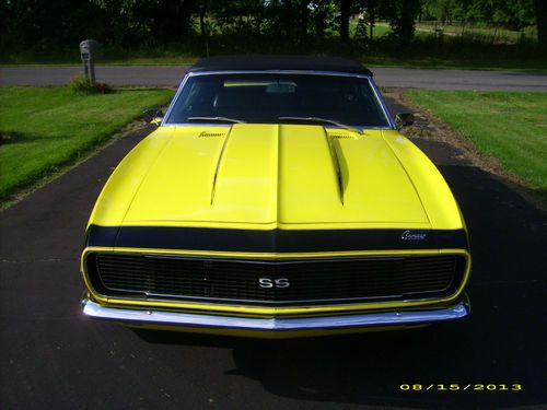 UP FOR BID IS A 1968 SS RS CAMARO CONVERTIBLE THAT IS A COMPLETE ROTISSERIE RESTORED CAR. EVERYTHING ON THIS CAR IS NEW-FROM TOP TO BOTTOM. THE ENGINE IS A 502 CU IN 502 HP GM RAM JET. THE TRANNY IS A 400. 12 BOLT REAR HOUSING WITH A EATON POSITRACTION DIFFERENTIAL. 373 GEARS. WILWOOD DISC BRAKES ALL AROUND. CHRIS ALSTON CHASSIS WORKS SUBFRAME WITH COILOVER SHOCKS. TUBULAR CONTROL ARMS. RACK AND PINION STEERING WITH ALSTON CONNECTORS. HOOKER HEADERS AND FLOMASTER MUFFLERS. NEW TOP AND NEW INTERIOR. BUYER IS RESPONSIBLE FOR SHIPPING. OVER $100,000 INVESTED (HAVE RECIEPTS) YOUR GAIN-MY LOSS. THANKS FOR LOOKING AND GOOD LUCK.