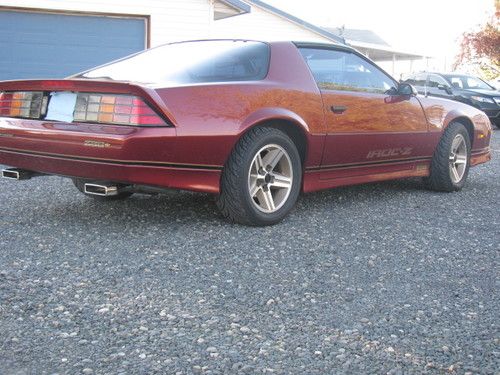 This is a very nice 1987 IROC Z. I am a very small dealer that only buys a few select cars per year. Mostly just a hobby I only buy very nice cars that are low miles and have clear titles. This 87 IROC was bought in Spokane Washington at a Dealers only Collector car auction! It is a one owner car with a accident free car history according to auto check. As that is how the IROC was described at the auction. I bought the car in May of this year and since then have been driving and enjoying the car along fixing any issues that I have noticed. All gauges work as they should, all lights work as they should including the fog lights and the center rear brake light! Power windows and console mounted hatch release work as they should, All window are tinted including the rear window! The condition of the tinting on the side window is just ok and should be redone at some point. The IROC has a Clarion AM/FM CD with a large Sony amp under the seat It has large subs built in boxes in the back hatch area and high out put speakers up front this car will Rock You.. I have added New Tires all the way around, New performance brake pads, New struts for the rear window hatch, New exhaust system from the cat back. The original owner kept the car garaged or on his carport always! This cars overall look is very good for a 87 IROC and with only 122430 Original miles it shows well with the factory paint job! It has just a little sun fade on the drivers side of the hood and a small area just behind the left T-Top and on the top of the drivers side rear wheel! Will include photo's of these areas. These are very minor and you have to be right on top of the car to notice! The rest of the body and paint are amazing considering it's all Original! The wheels are nice with locks and new IROC caps, The factory spare tire and jack and owner manual are included with this IROC. The 5.7 fires right up and is very strong the overdrive automatic shifts firm and quick and will break the tires lose as it shifts from 1st to 2nd on a recent 200 mile trip the 5.7 returned 23 mpg running mostly 75-80 mph. This steering is dead on, and the handles very nice. The tops fit and seal up well, the bags and straps are in the back of the hatch for storage! As with all cars this age it is sold where is as is.. As soon as I am receive bank wired fund I will FedEx Title to new owner.